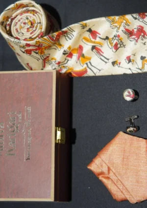 Bhagalpuri pure silk fabric with block printed Saura art in maroon/yellow and contrast plain silk pocket square with matching cufflinks. A formal suit will be the perfect ensemble to accessorize these stylist piece or may serve as a classic present either for yourself or your near and dear ones.