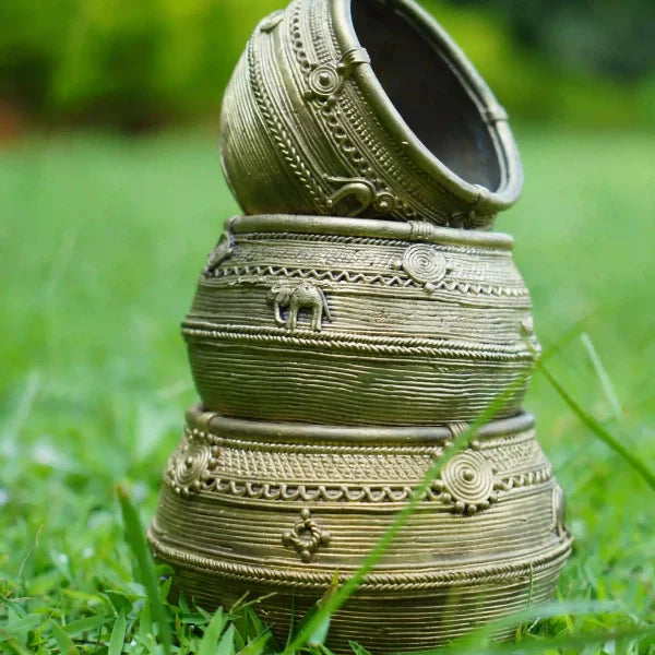 Handmade Dhokra bowl, inspired by the traditional Odiya unit of measurement called "manno" commonly used in the worship of Goddess Laxmi.Dhokra – A living bronze age craft that is still alive at the hands of artisans of Odisha Saptasajya are small villages in Odisha where these crafts have flourished since ages but the artisans have been overshadowed by middlemen. AtulyaKarigari works with Artisans and makes every effort to inform and educate them about new designs so that they can explore high level and survive in the market.
