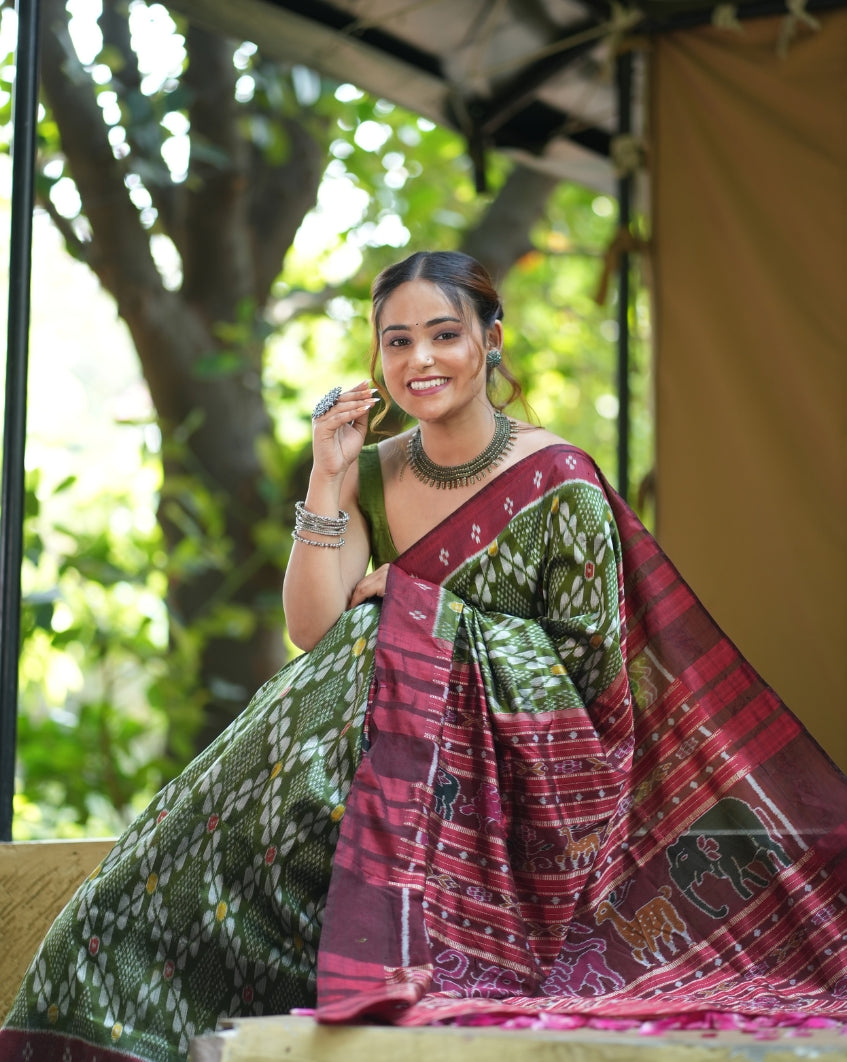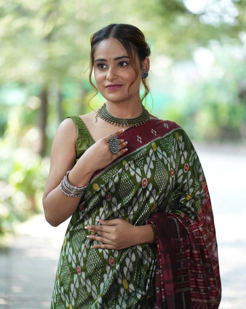 Tie dye technique of Odisha.Explore a curated range of handloom silk saree by our Artisans Sap Green & Maroon border saree with pasapalli design and traditional motifs on pallo. Club it with oxidized jewellery.The Nuapatna Khandua sarees are handloom Specialty from Nuapatna Cluster of Odisha ,traditionally popular for costumes of Lord Jagannath Puri,