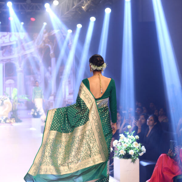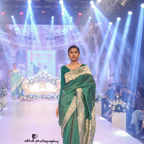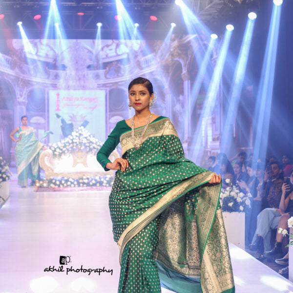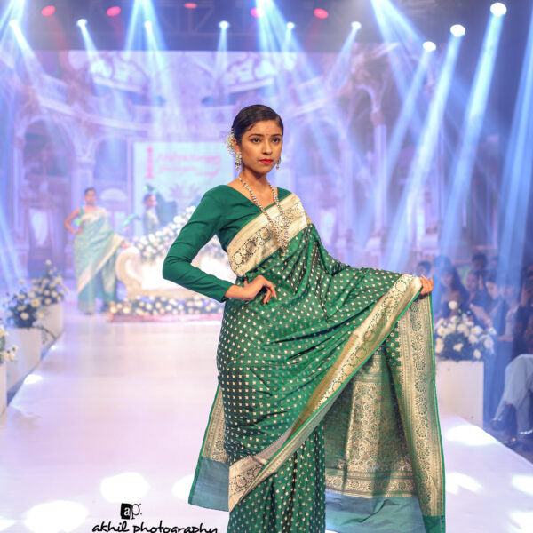 Bottle green banarsi saree with Butti design along with Zari Border makes it simple yet beautiful in their own way. Model wearing the blouse is for shoot purpose and separate matching blouse will be provided along with the saree.