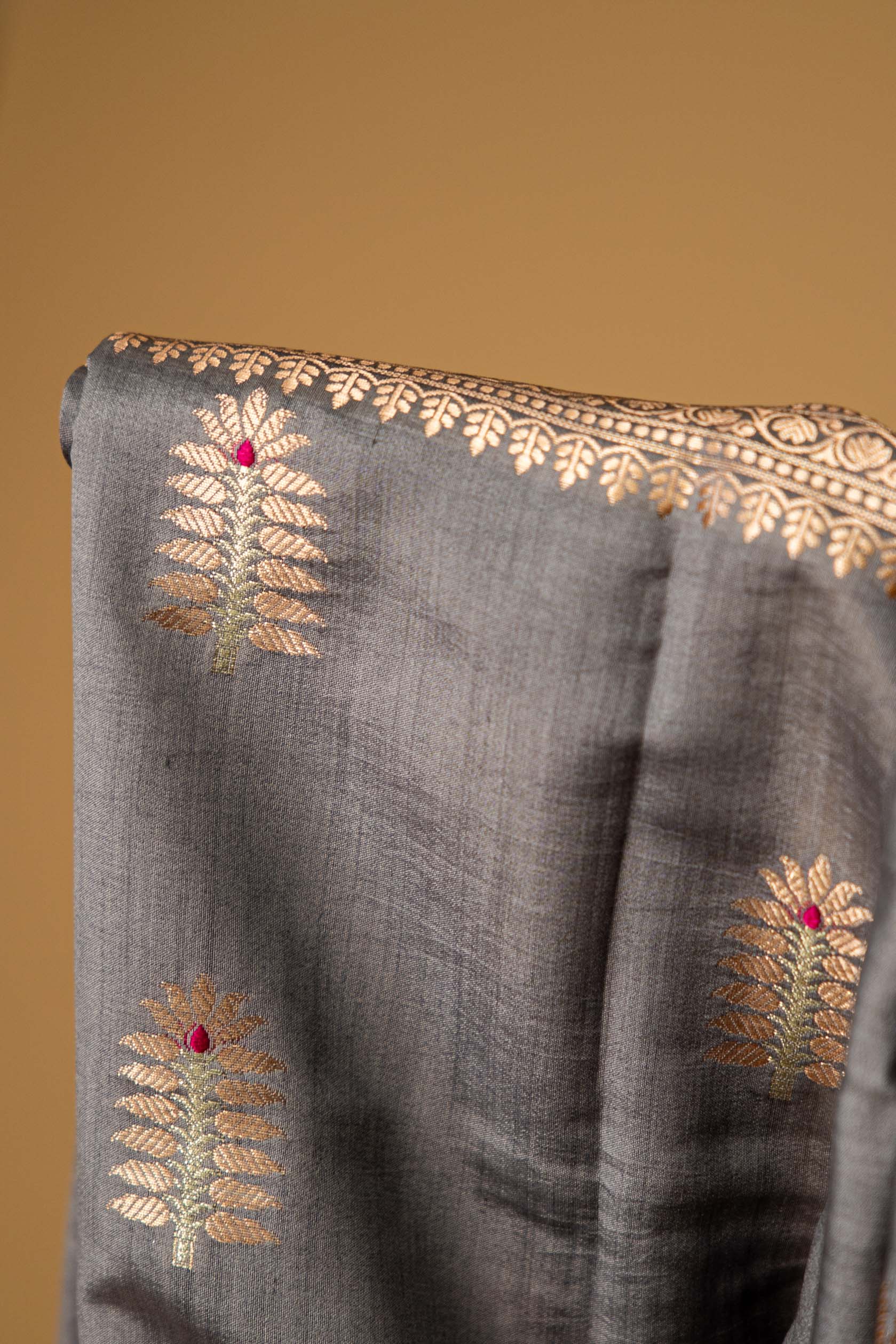 Grey Banarsi Cotton Silk Saree – Cactus Motif with Resham Work