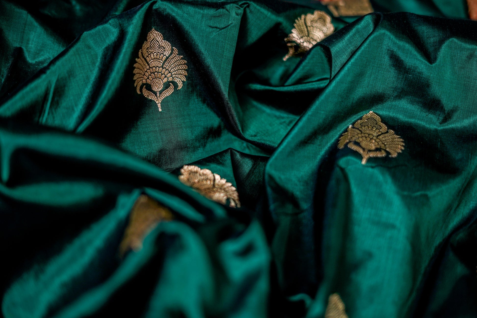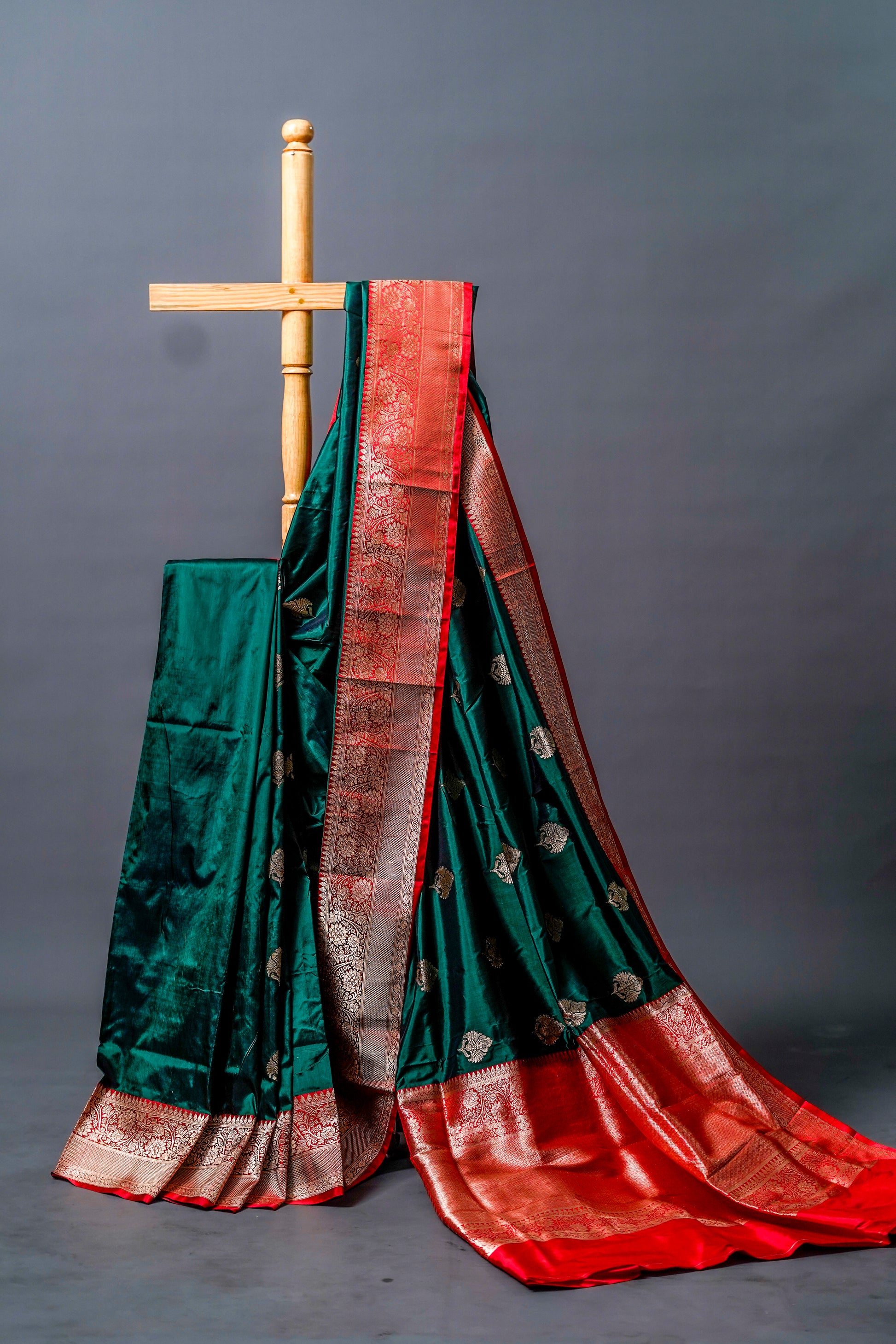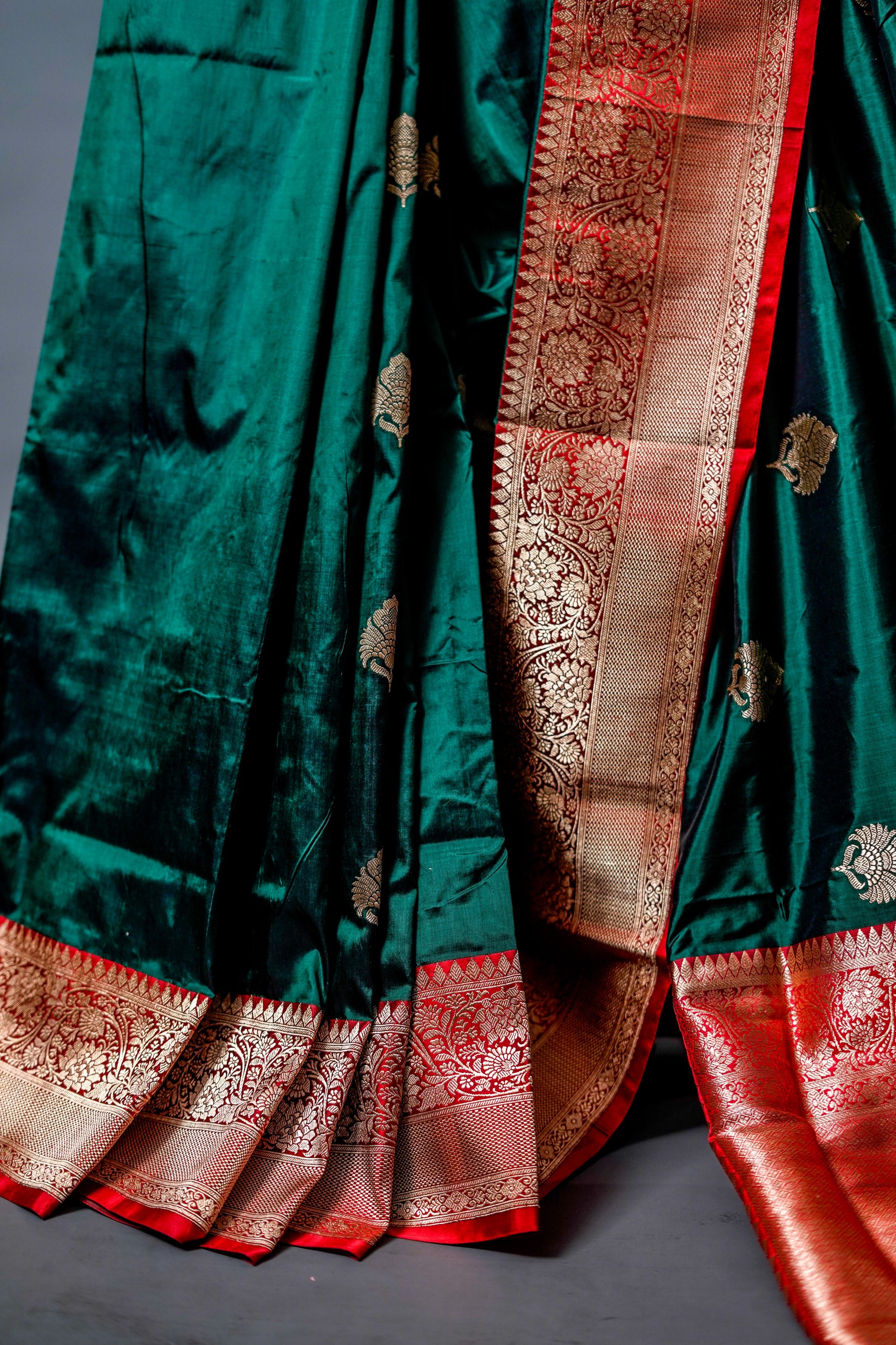 - Colour: Deep Green with Gold Zari Work and Contrasting Red Border