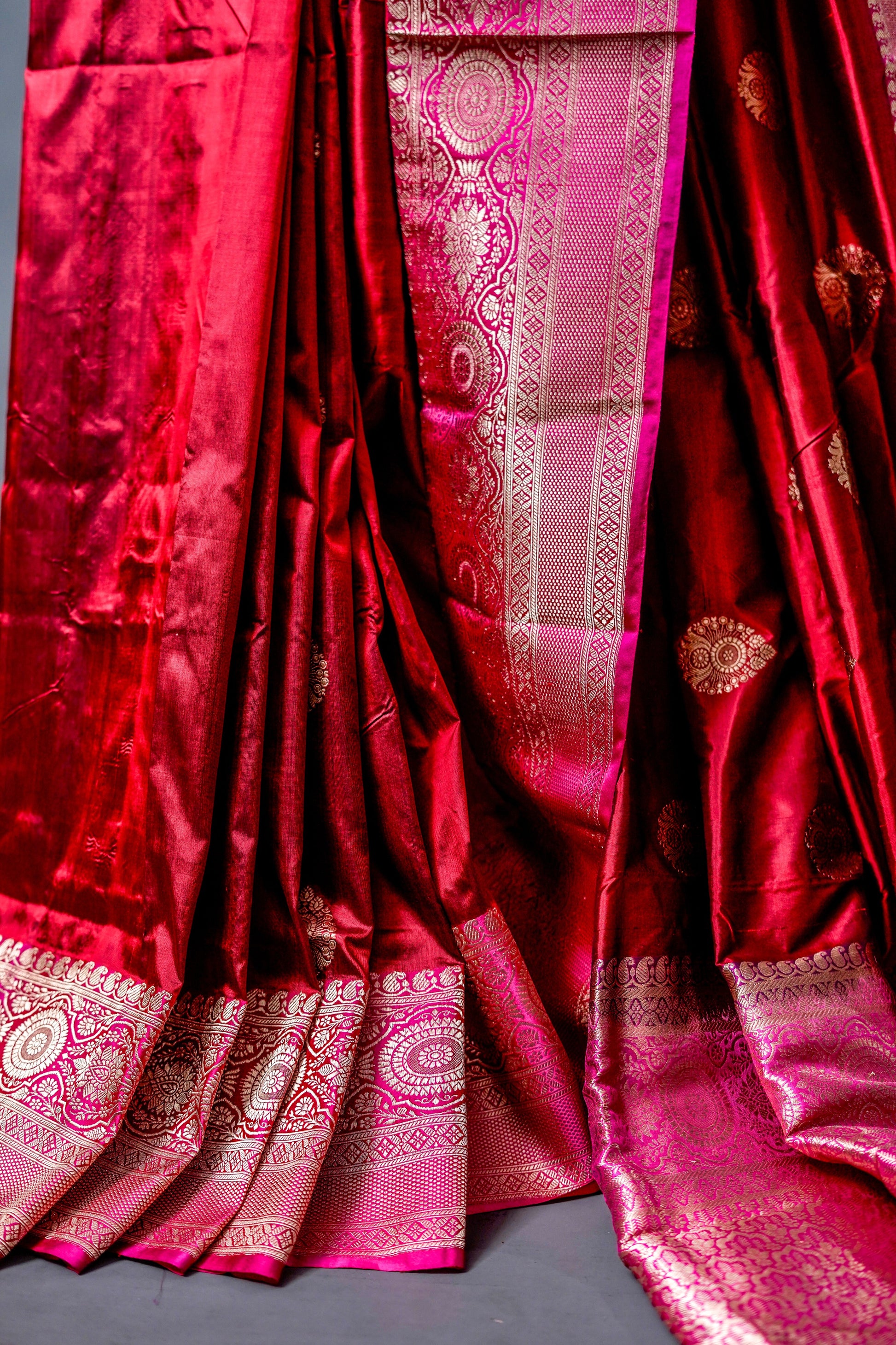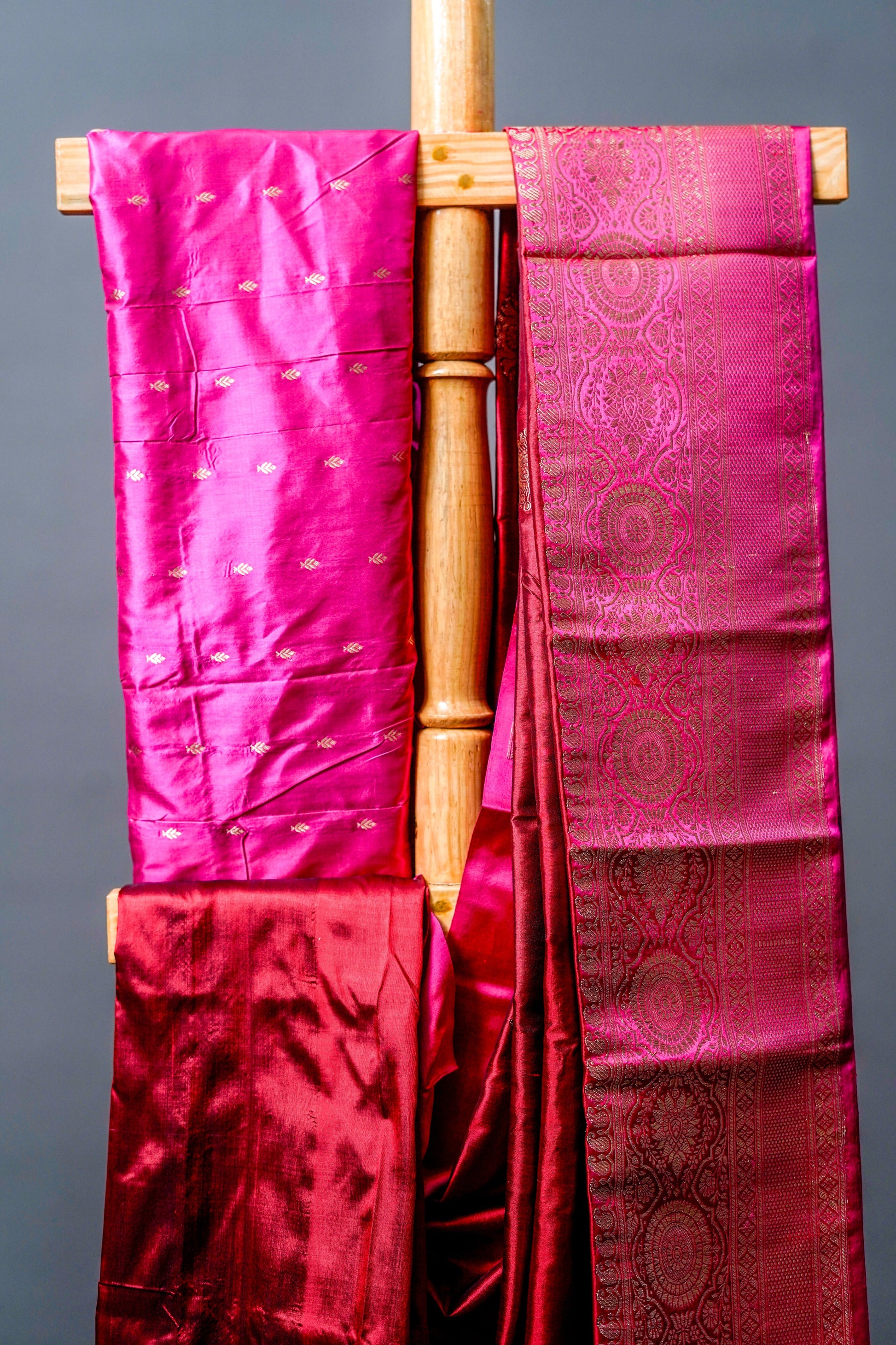 - Colour: Deep Magenta and Maroon with Gold Zari Detailing