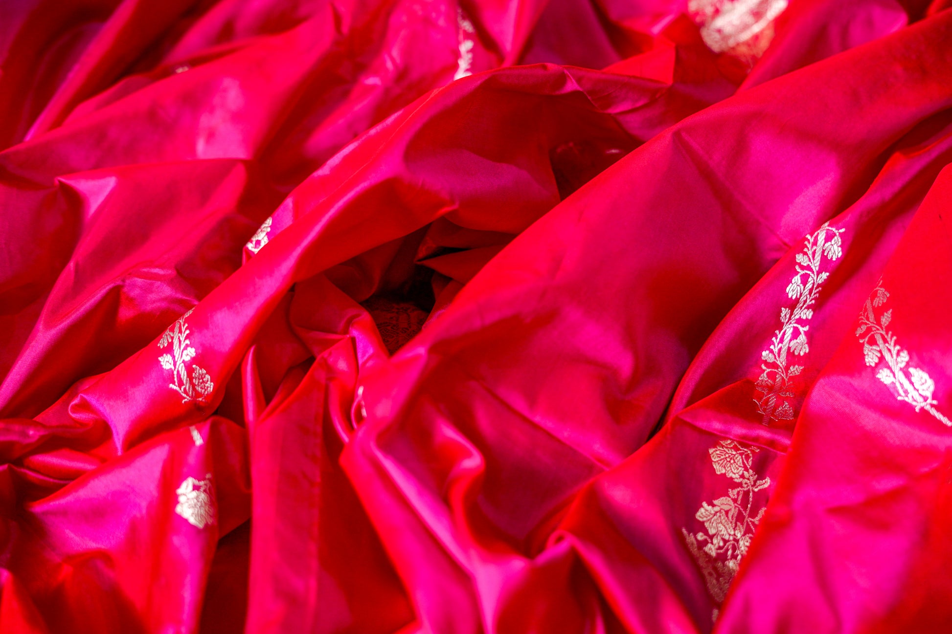 Handwoven Banarasi silk saree with intricate zari motifs, crafted with elegance and grace.