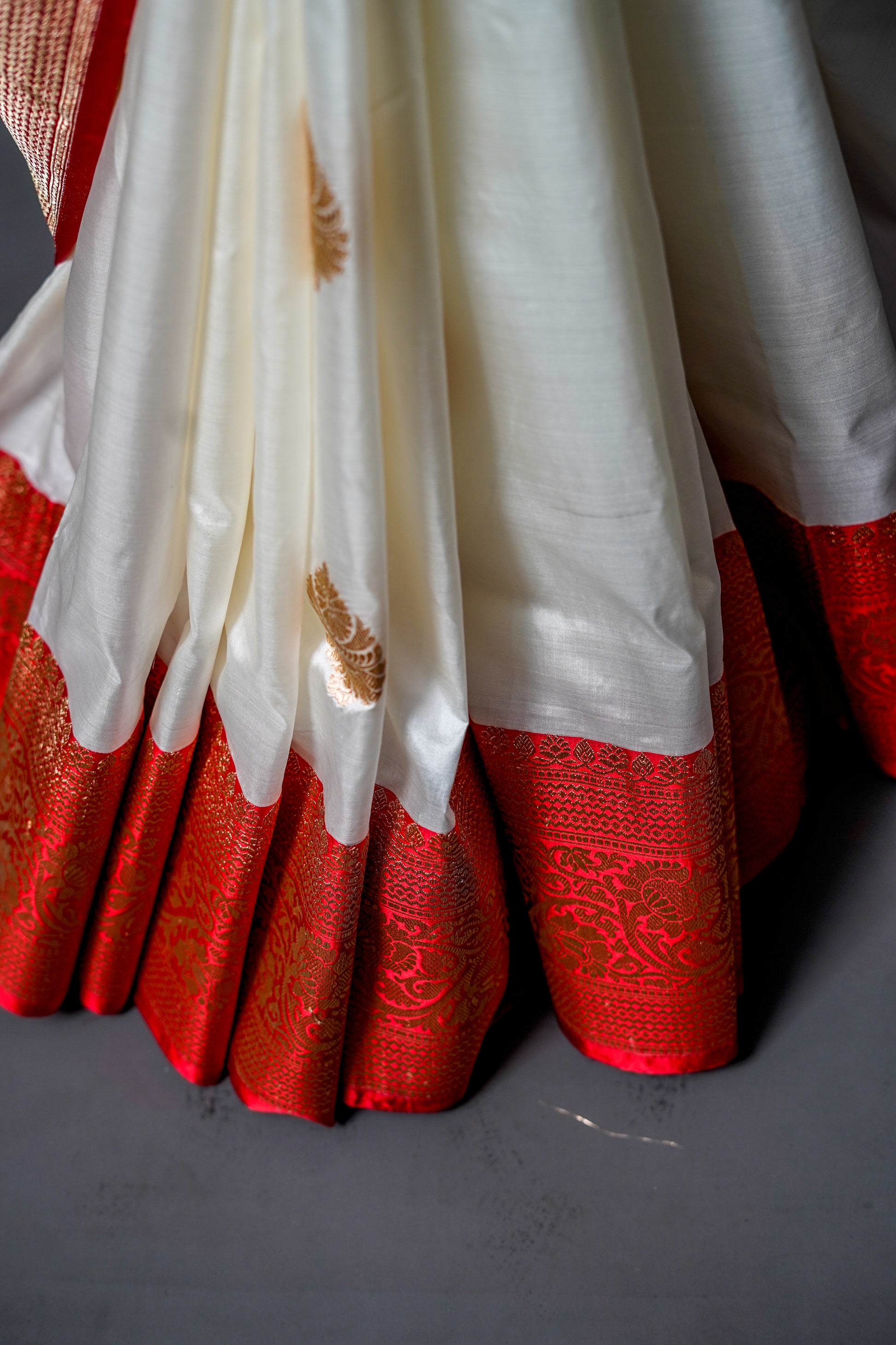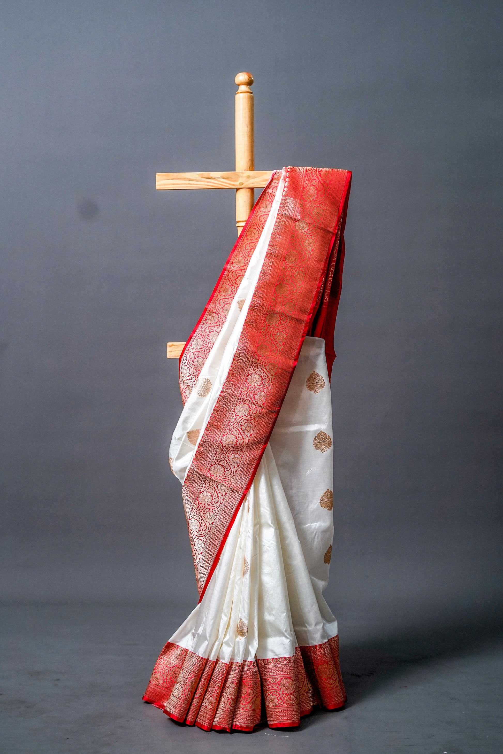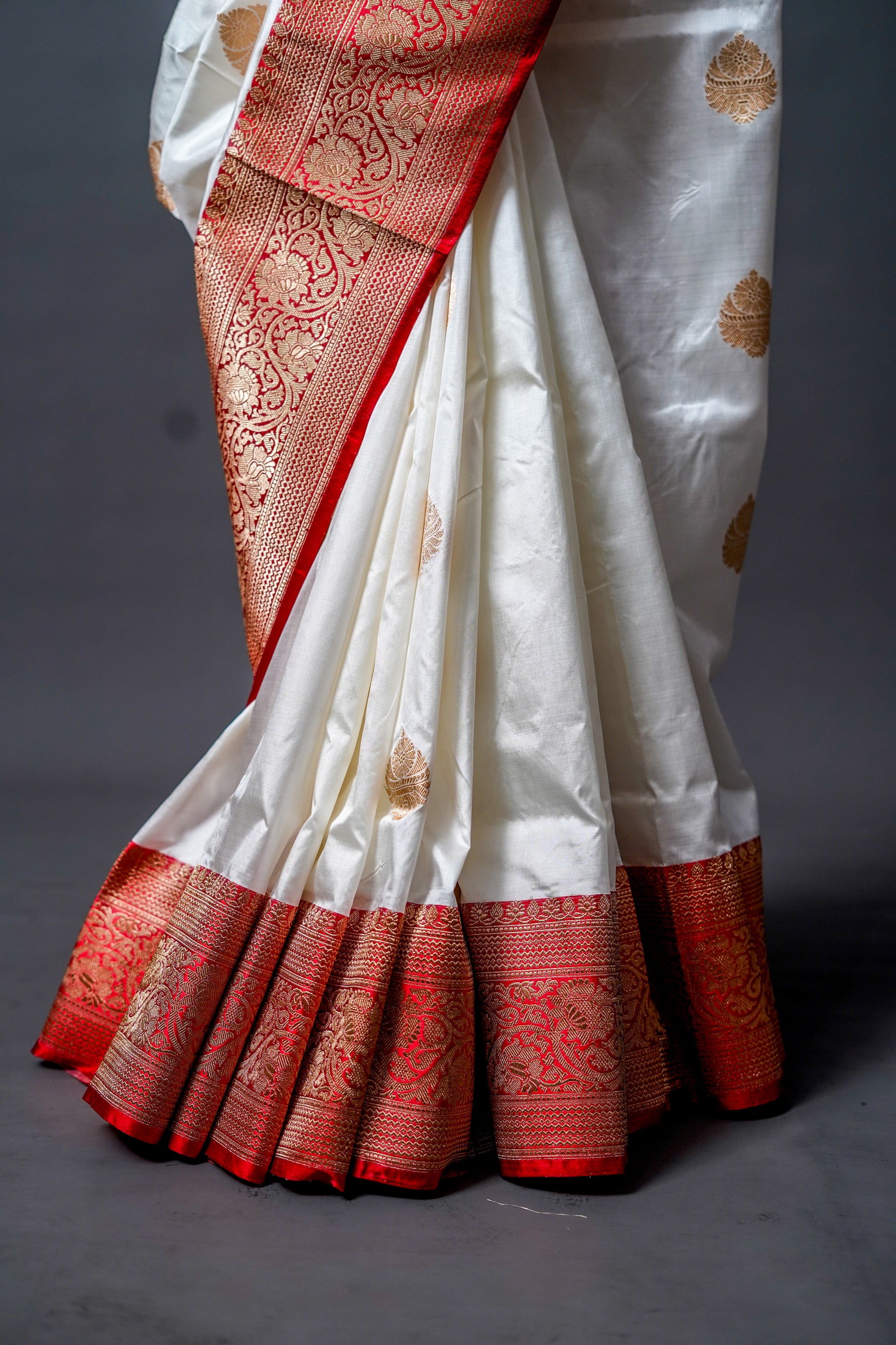 A graceful white saree with a broad, ornate brownish-red border and golden zari motifs, perfect for grand occasions