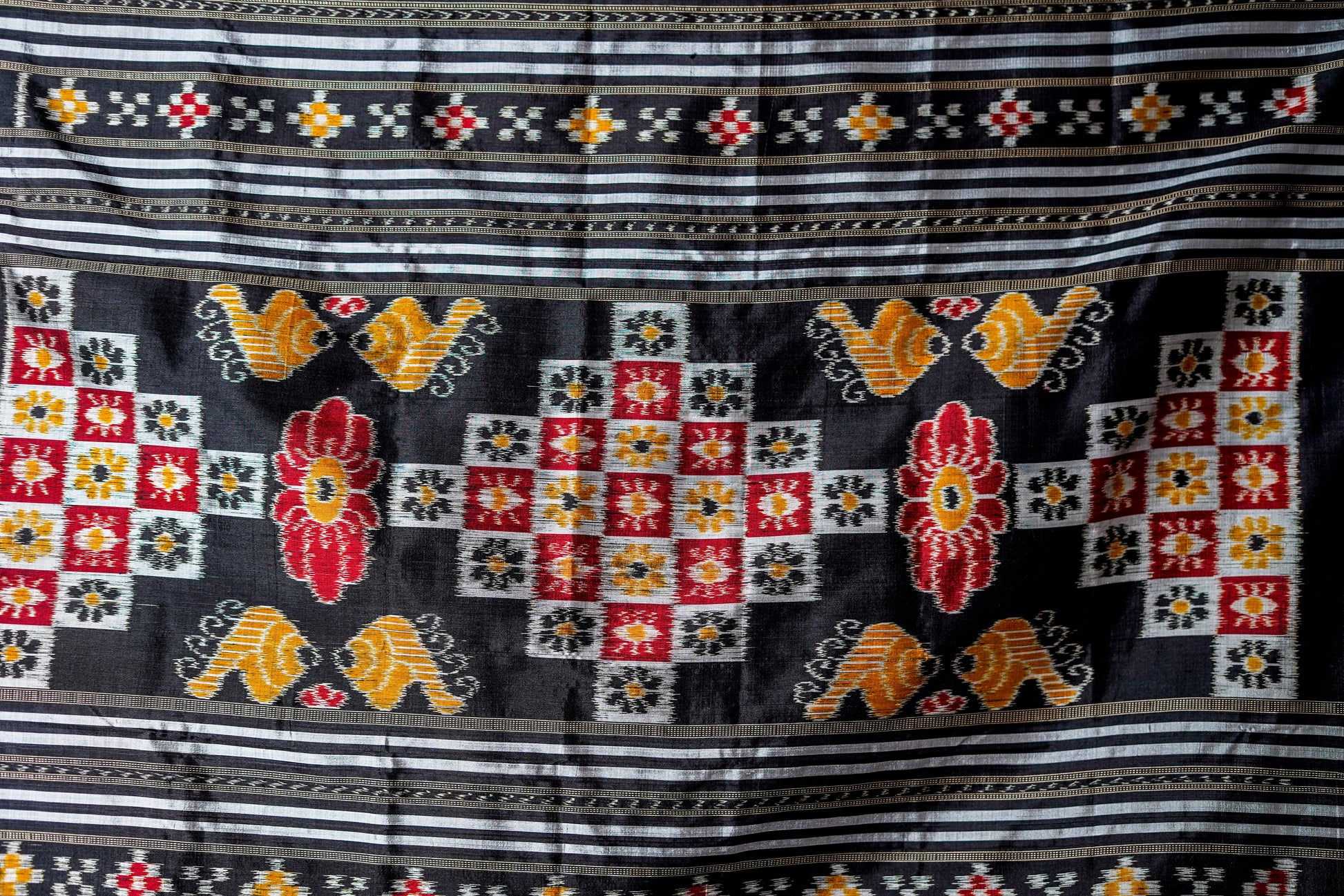 Khandua Silk features intricate ikat patterns, vibrant colors, and traditional motifs woven in fine silk threads.