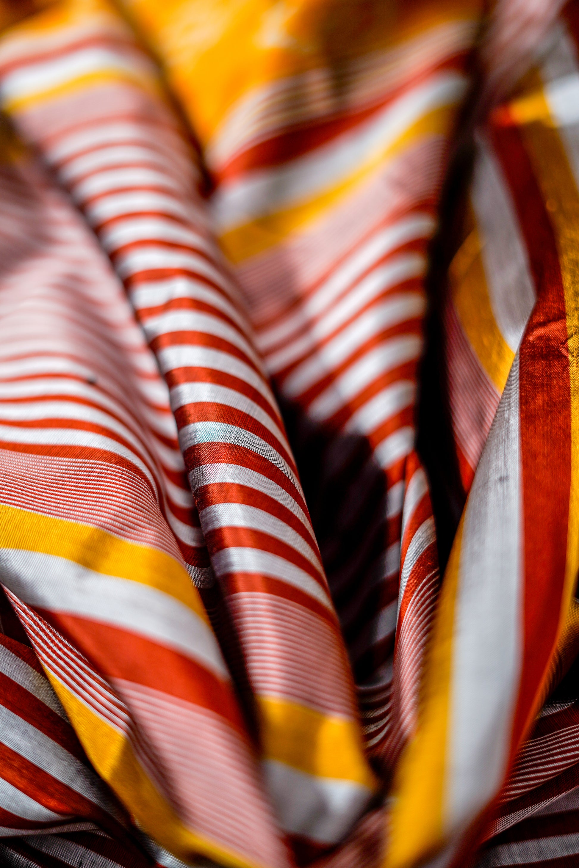 Khandua Silk features intricate ikat patterns, vibrant colors, and traditional motifs woven in fine silk threads.