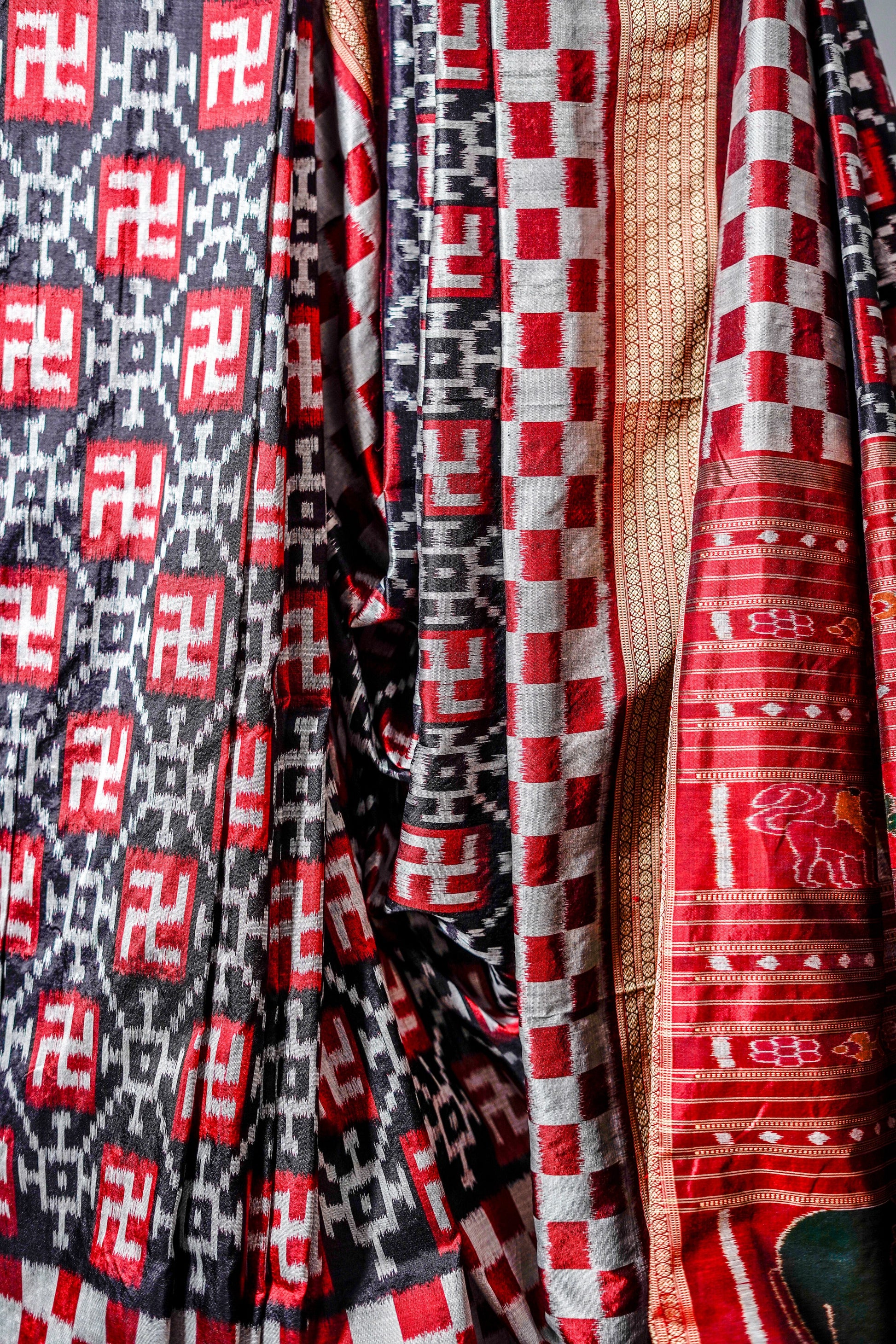 Khandua Silk features intricate ikat patterns, vibrant colors, and traditional motifs woven in fine silk threads.