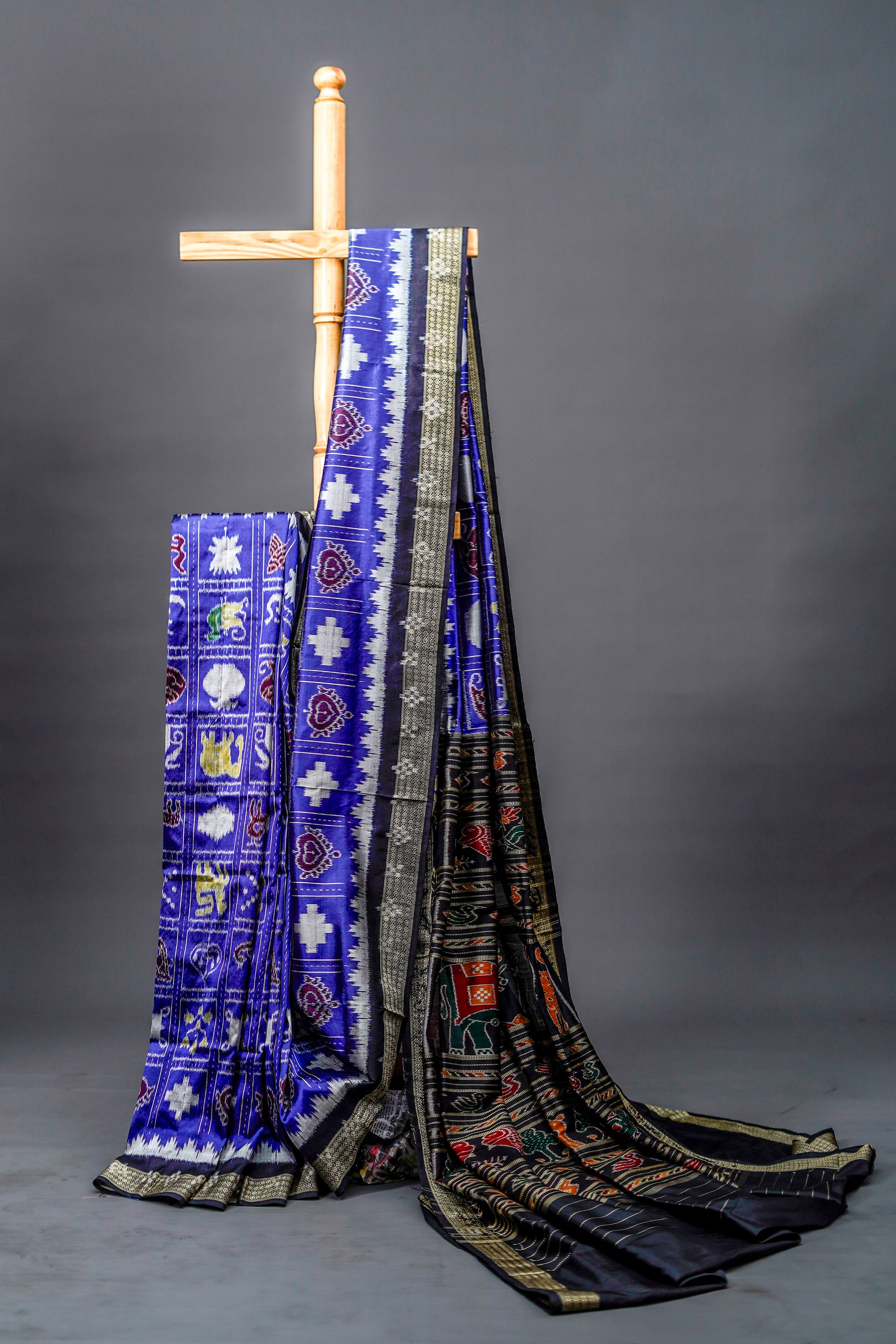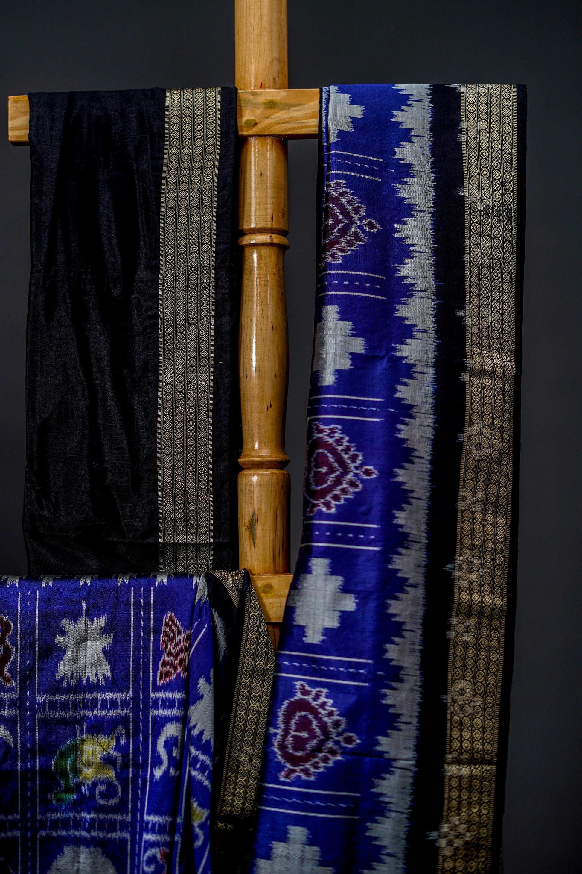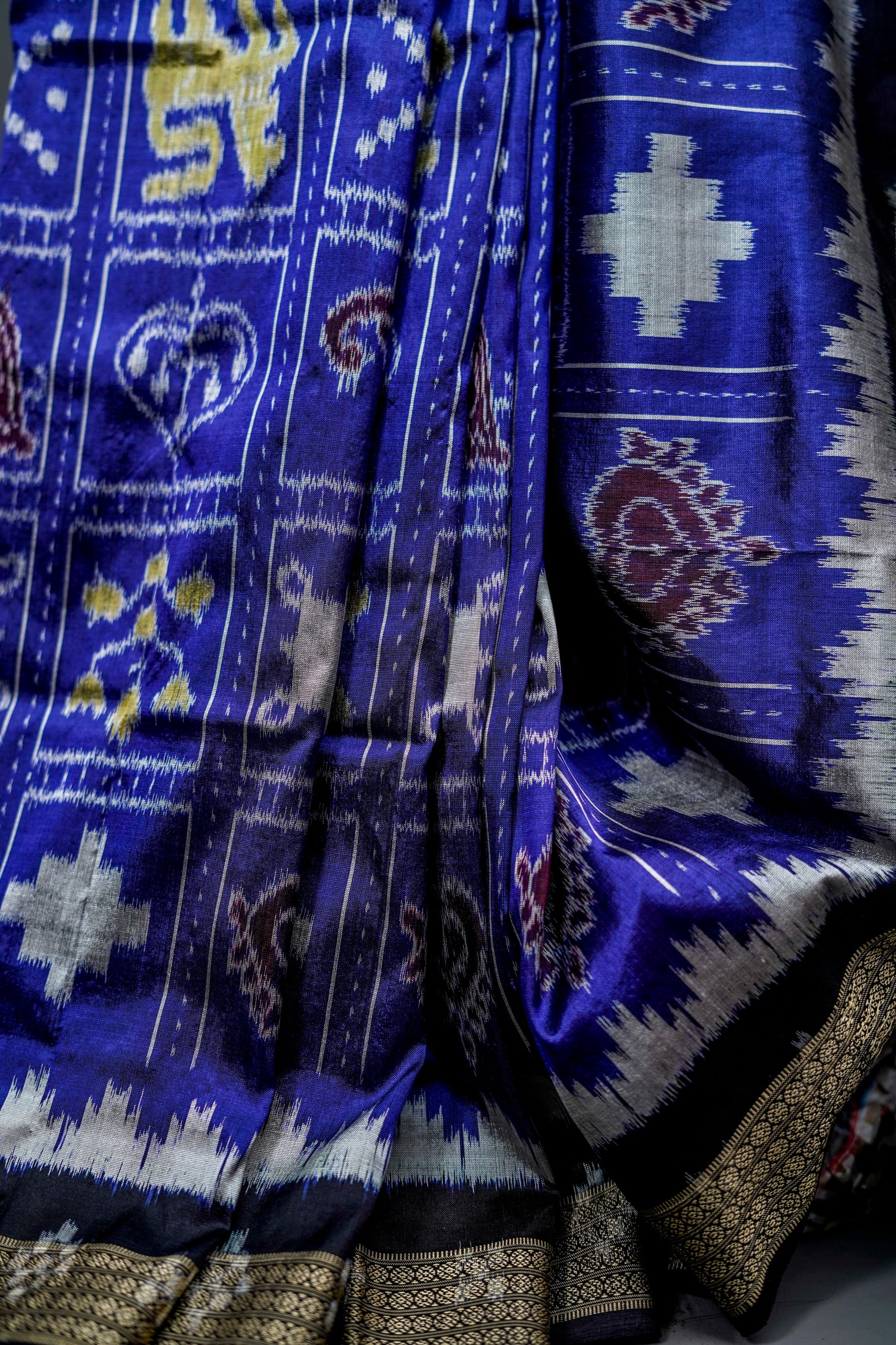 Khandua Silk features intricate ikat patterns, vibrant colors, and traditional motifs woven in fine silk threads.