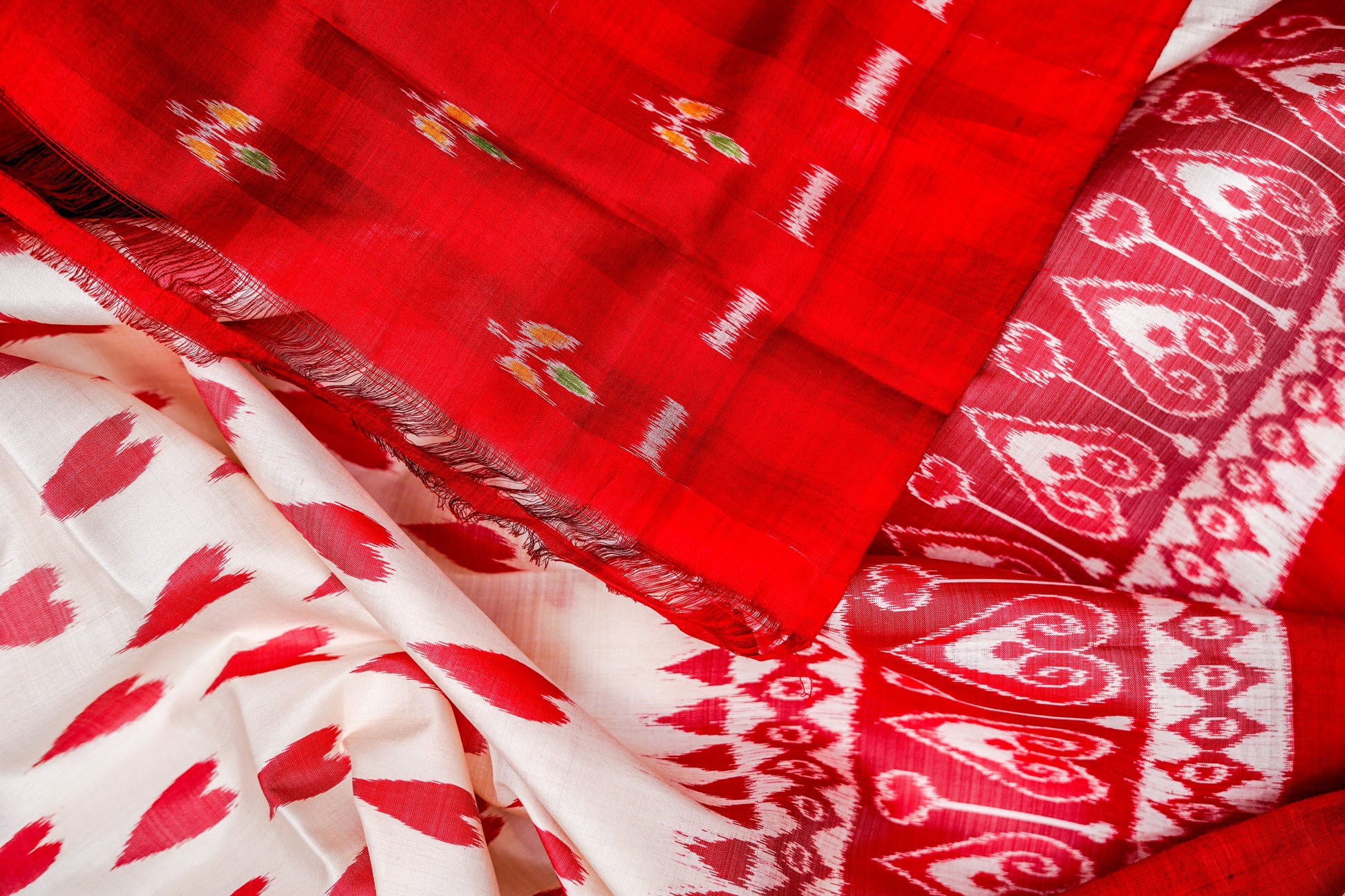Khandua Silk features intricate ikat patterns, vibrant colors, and traditional motifs woven in fine silk threads.