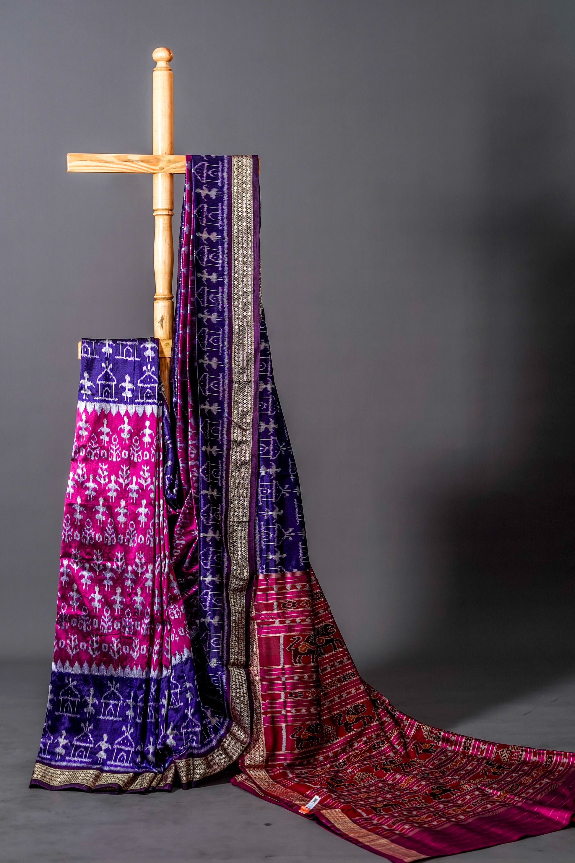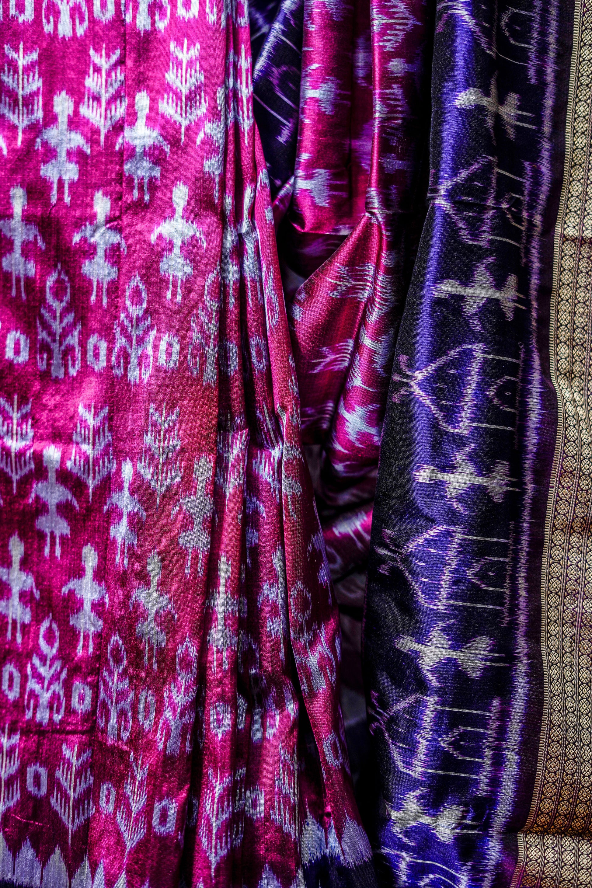 Khandua Silk features intricate ikat patterns, vibrant colors, and traditional motifs woven in fine silk threads.