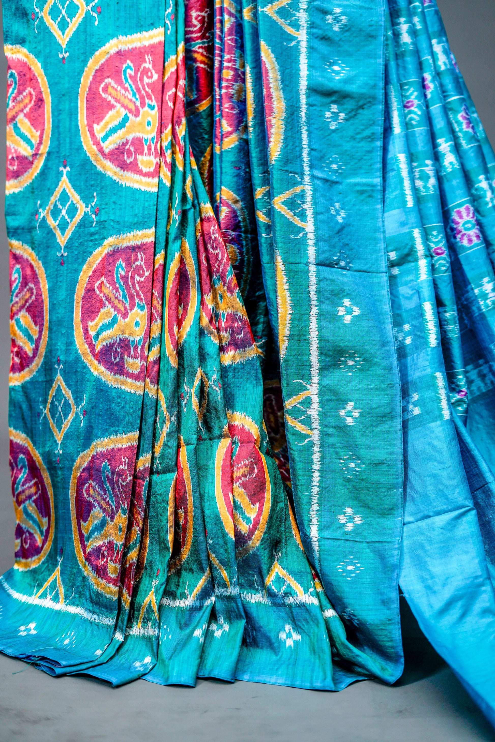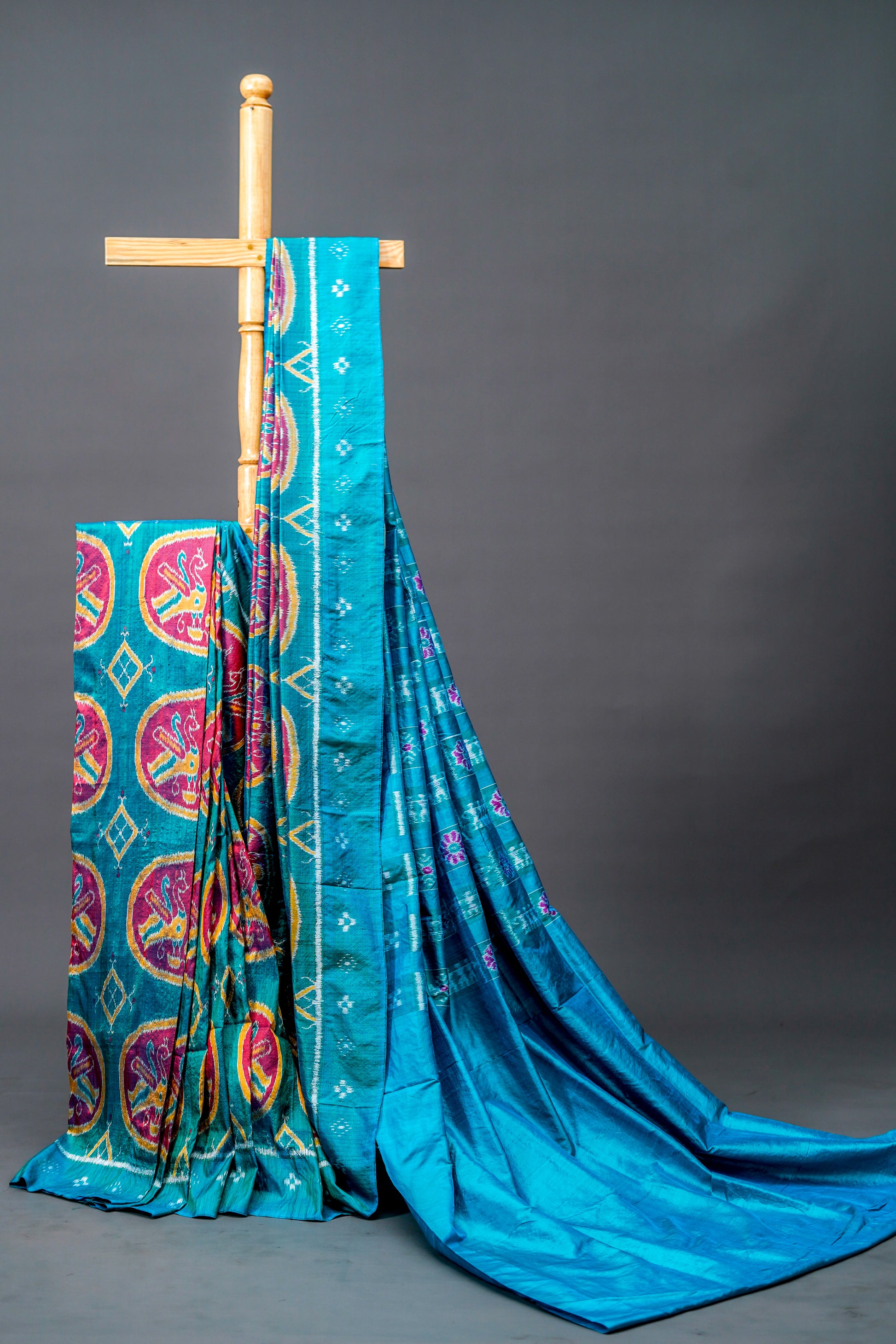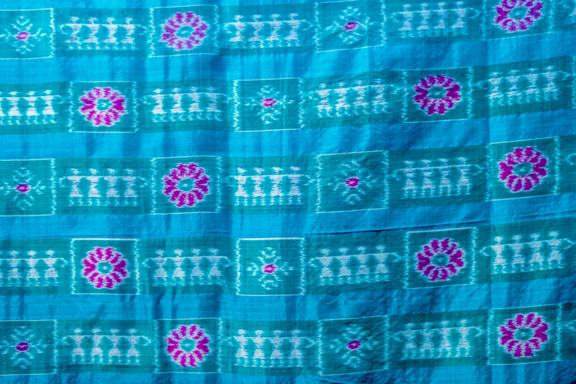 Khandua Silk features intricate ikat patterns, vibrant colors, and traditional motifs woven in fine silk threads.