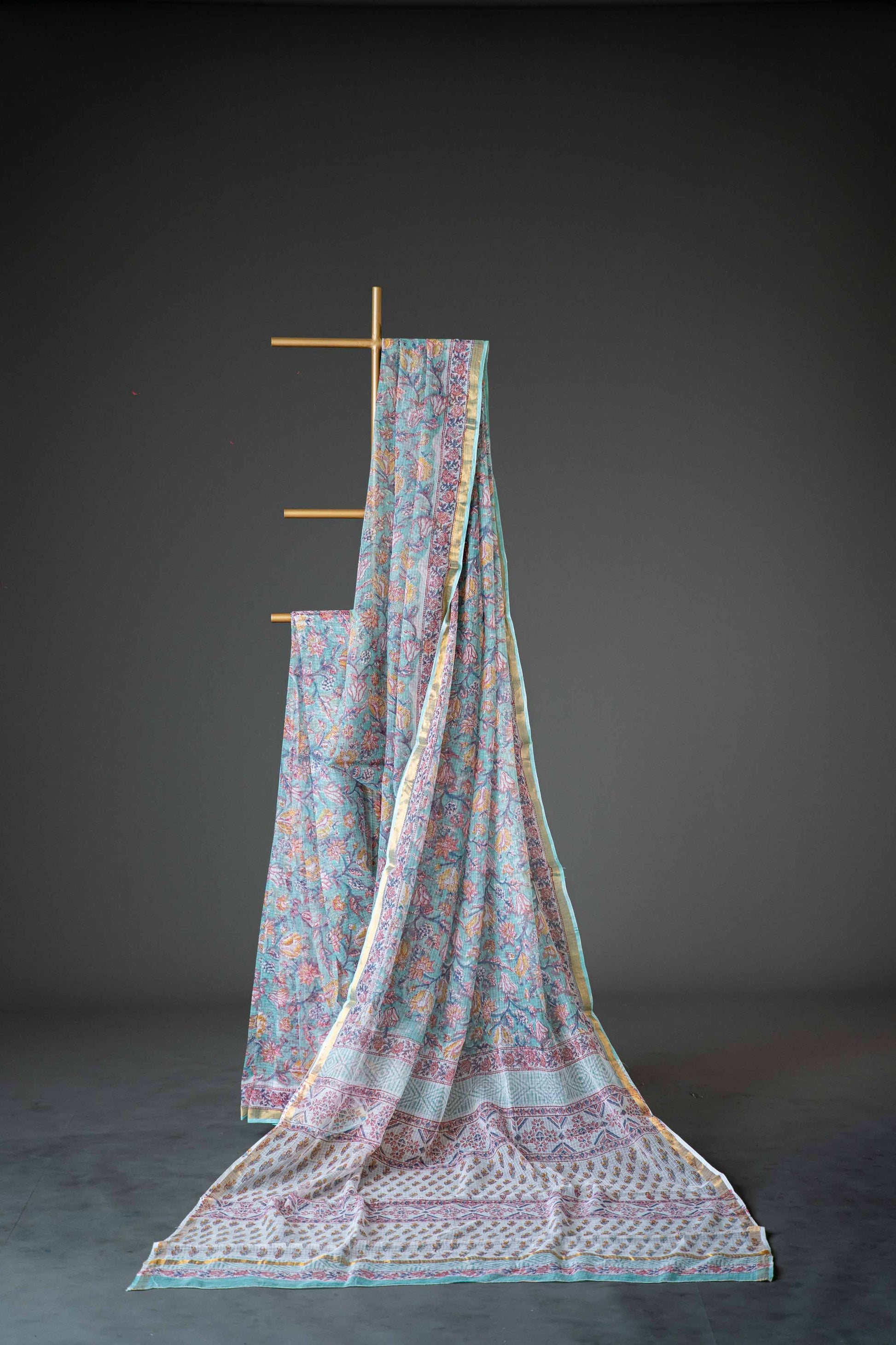 Kota Doria Saree – Light Green Hand Block Print, Pure Bagru Cotton