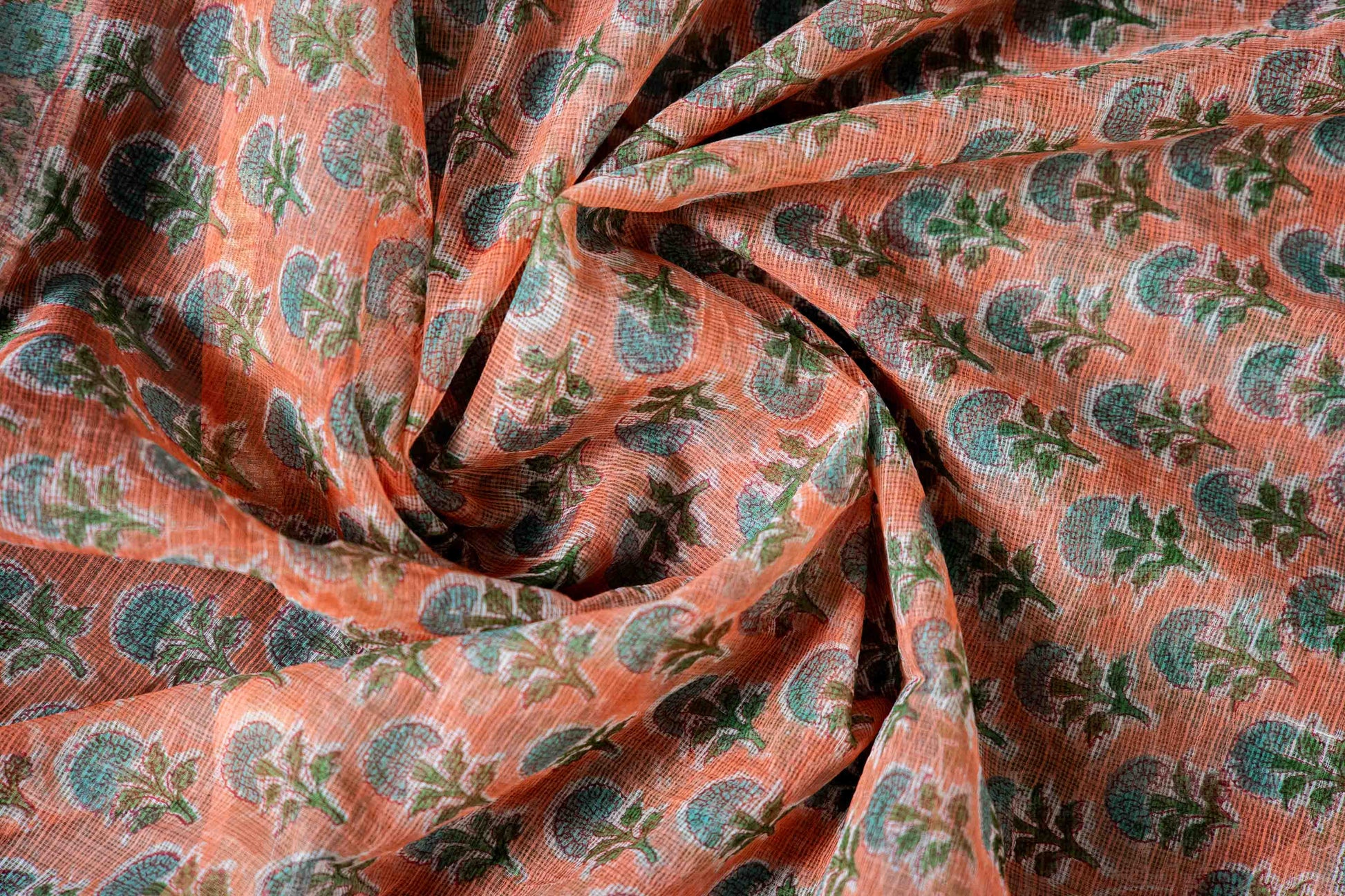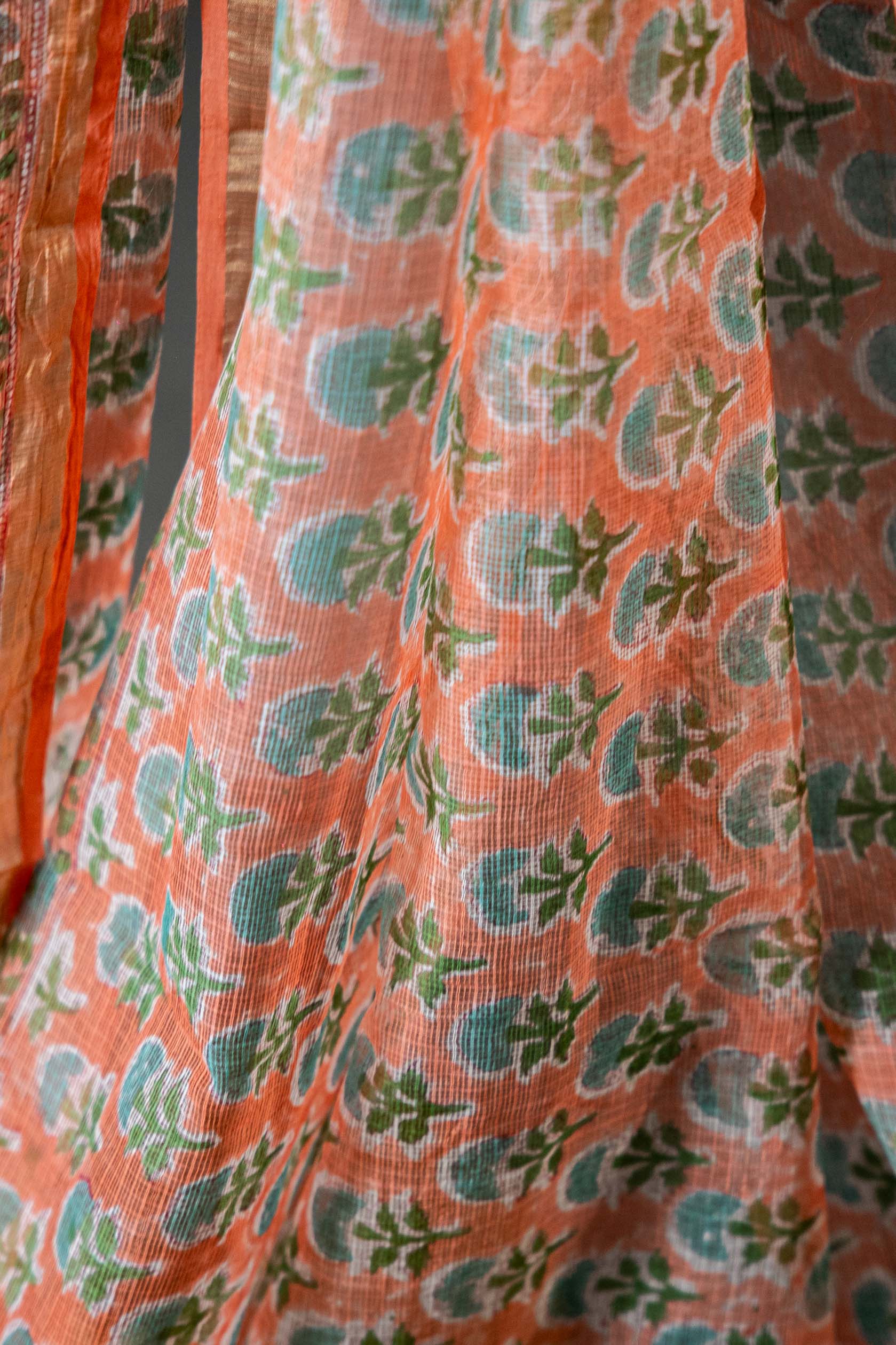 Kota Doria Saree – Light Orange Handloom Block Print, Bagru Cotton