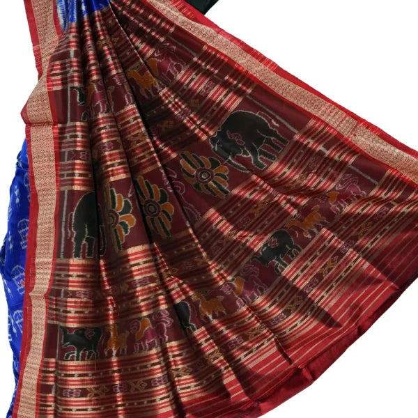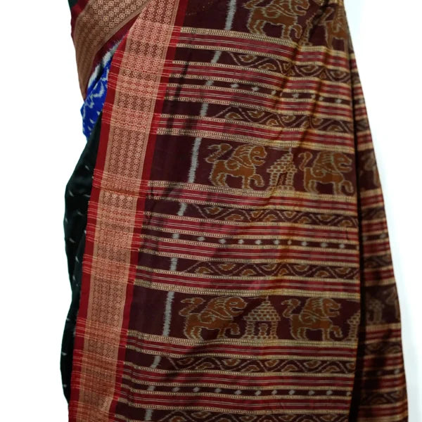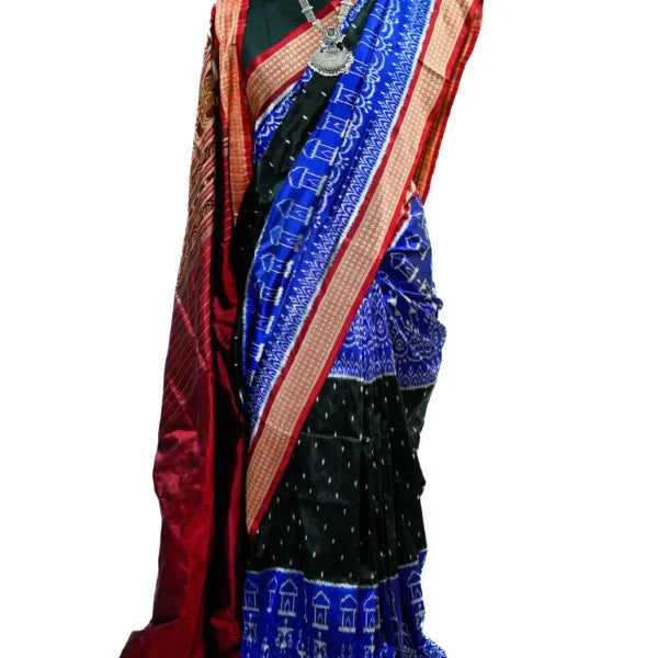 Our Royal blue and black saree contemporary design showcasing hut dots motifs in the body with minimal border complimenting the traditional motifs on pallo giving it a perfect corporate look. Club it with oxidized jewellery.The Khandua Silk sarees are Specialty of Handloom from Clusters of Nuapatna Odisha ,traditionally popular for offering to Lord Jagannath Puri.