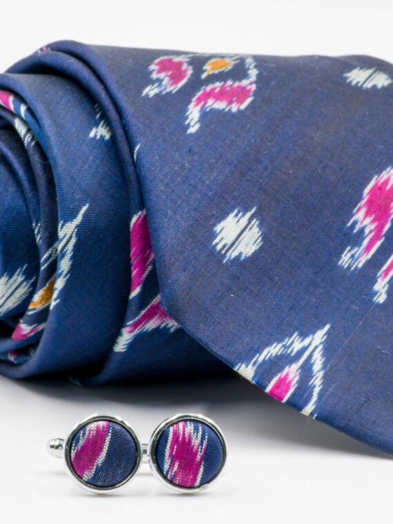 Material Khandua Silk Fabric Type Handweaved Ikat Fabric Tie Colour Navi Blue with White-Magenta motifs Style Khandua ikat Tie and Cufflink. Size Standard Weight NA/td>