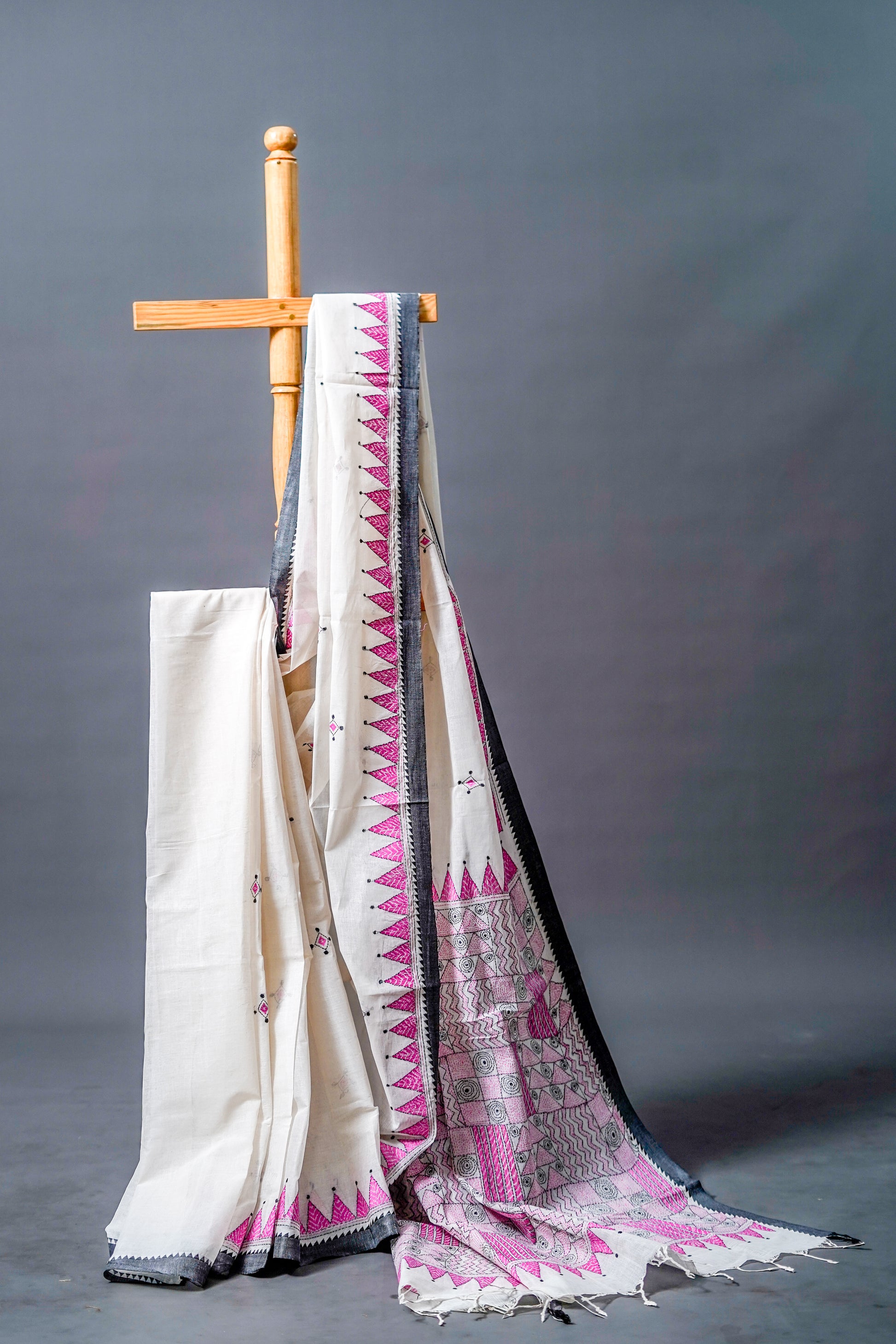 - Style: Sophisticated Contrast – Clean body with minimal dot motifs, bold triangular border in magenta and black, and a detailed pallu with geometric tribal influences