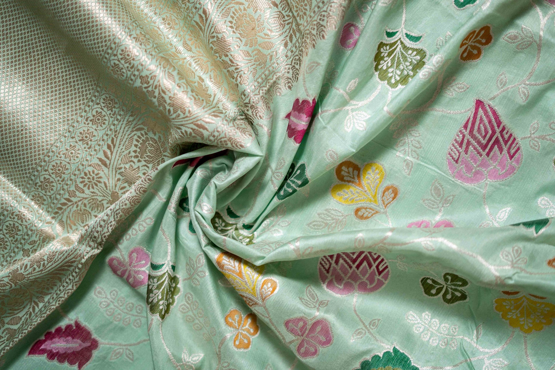 Pure Katan banarsi with traditional border. Colourful motif is ideal for your wedding collection.