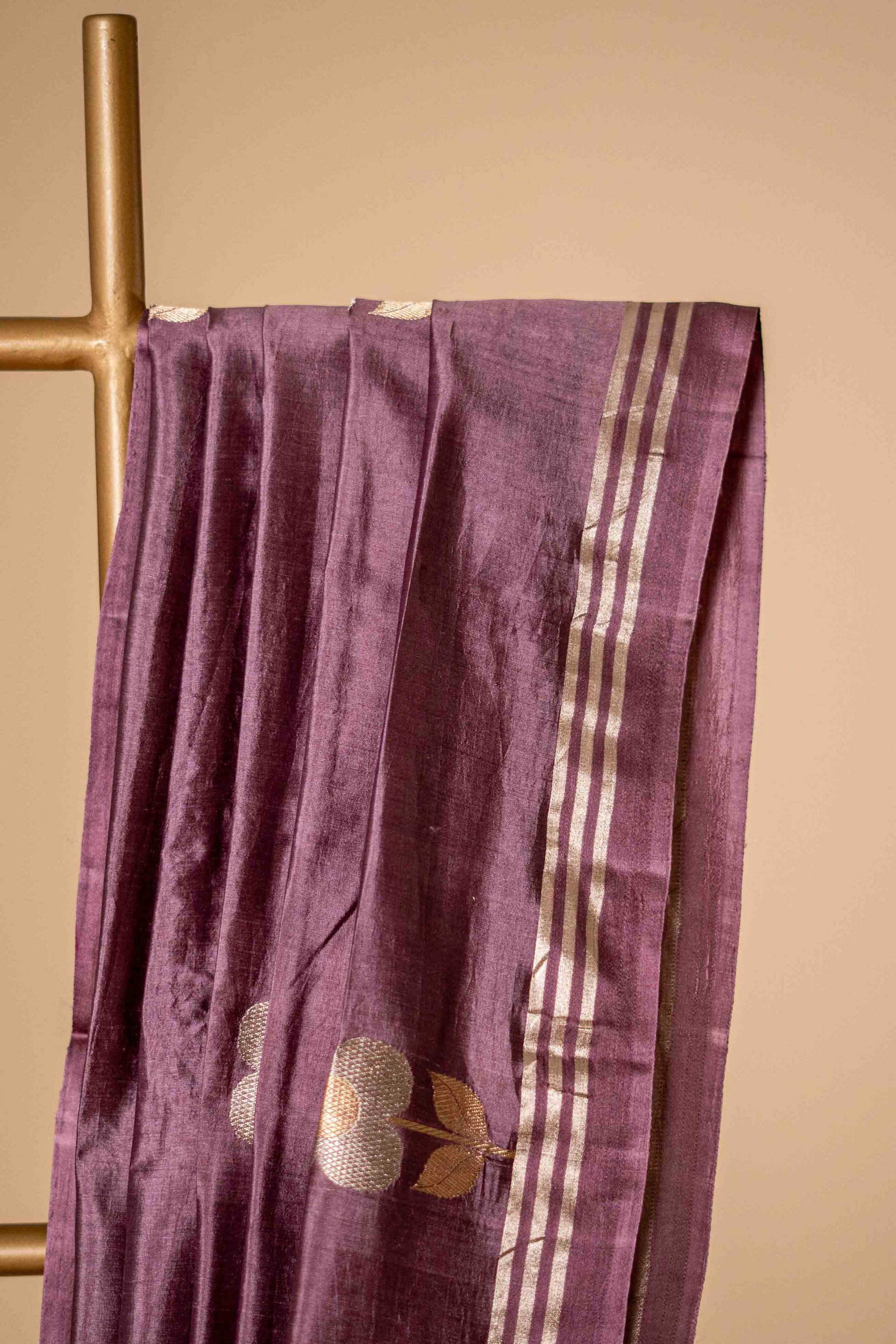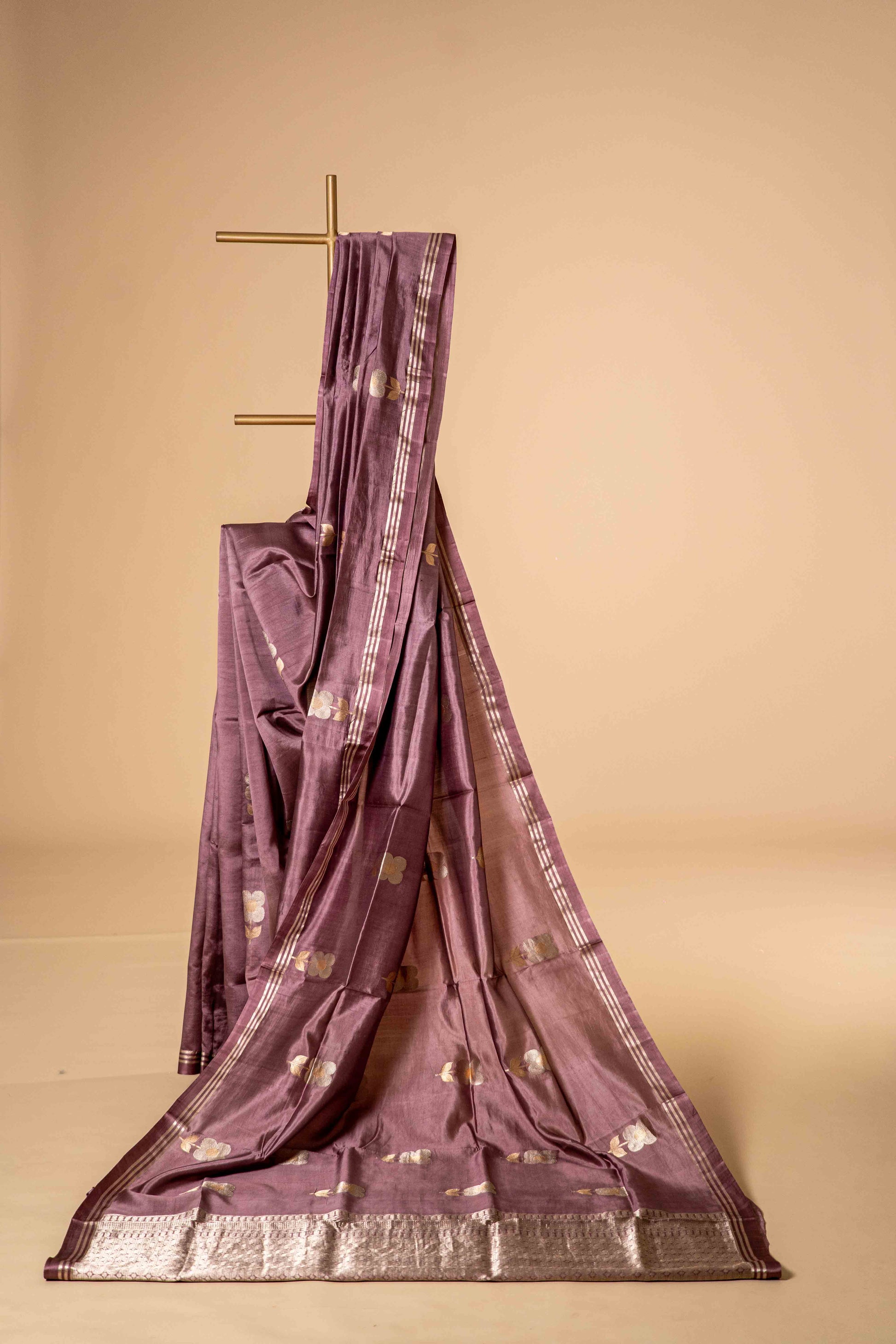 Pure Kora Silk light weighted with golden flower and leaf motif along with traditional border.