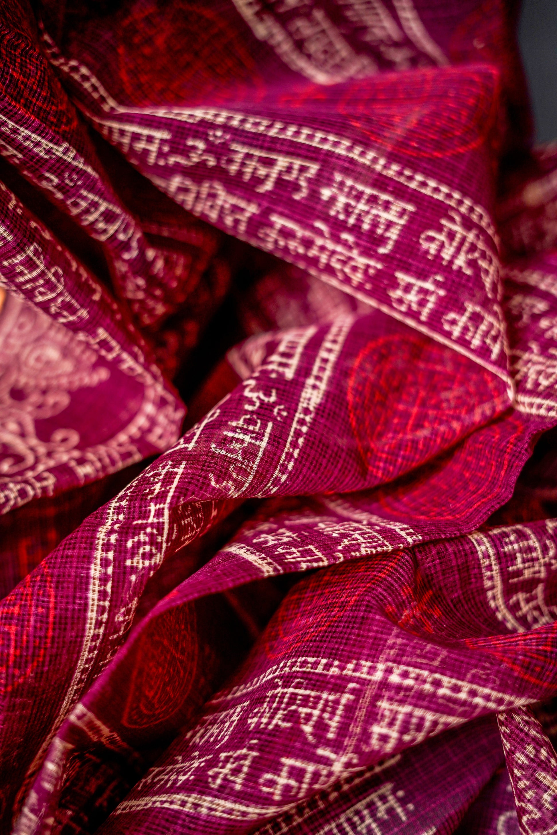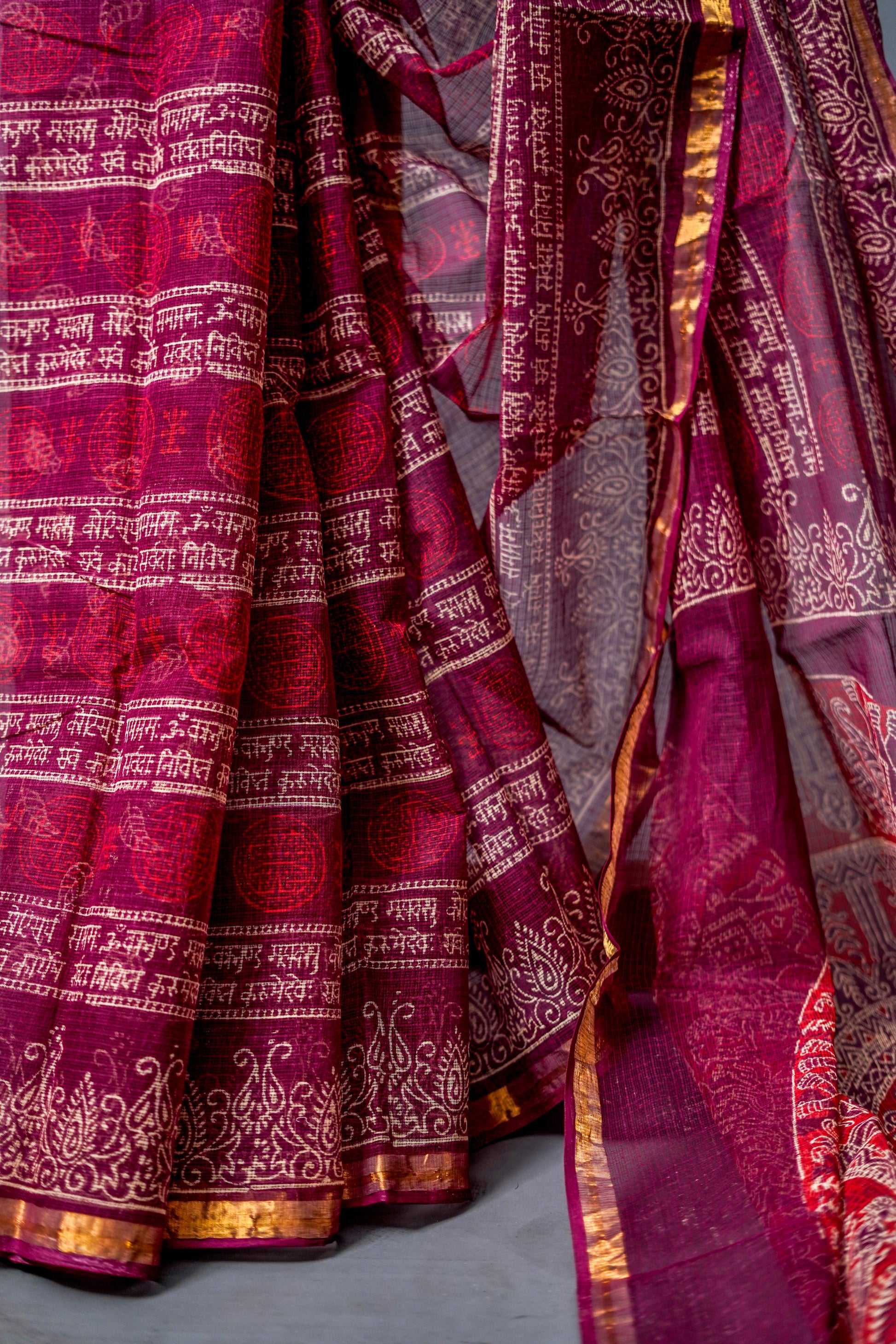 Pure Moonga Kota (Deep maroon base with intricate gold and white patterns)