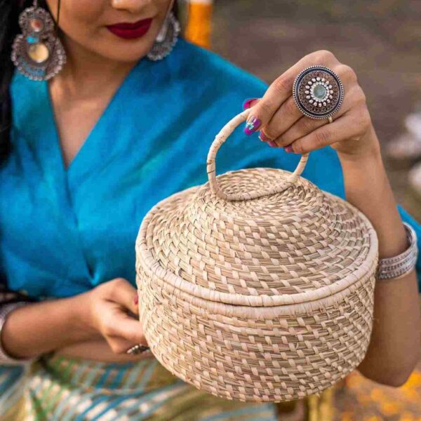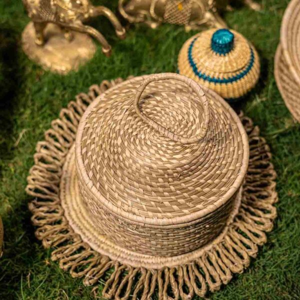 Handmade Golden Grass Round Utility Box, designed to store your precious items in a trendy way and also good for gifting purposes.
