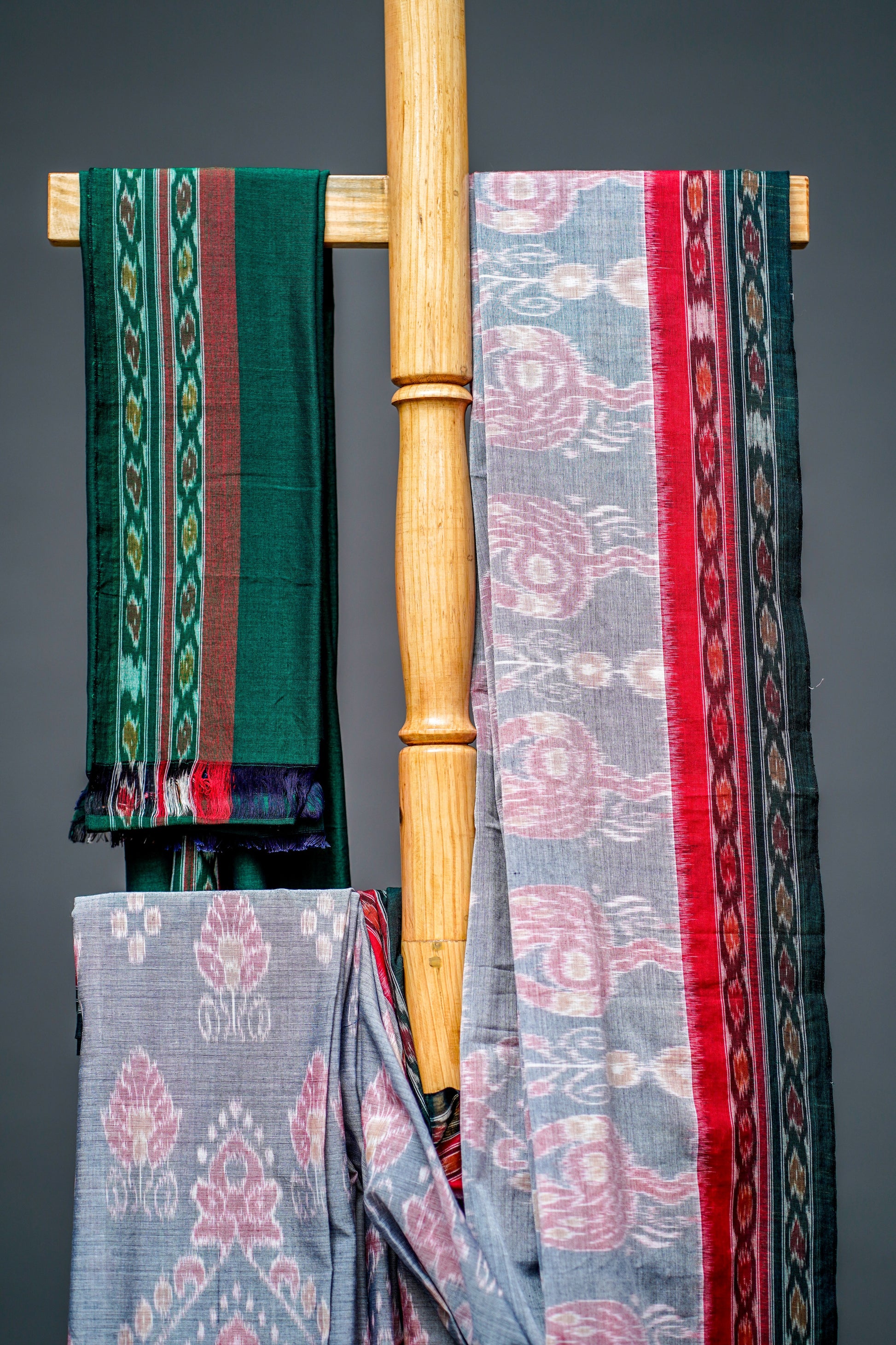 - Colour: Soft Grey Body with Light Pink and Off-White Ikat Motifs; Red and Black Border; Contrasted with Green Pallu