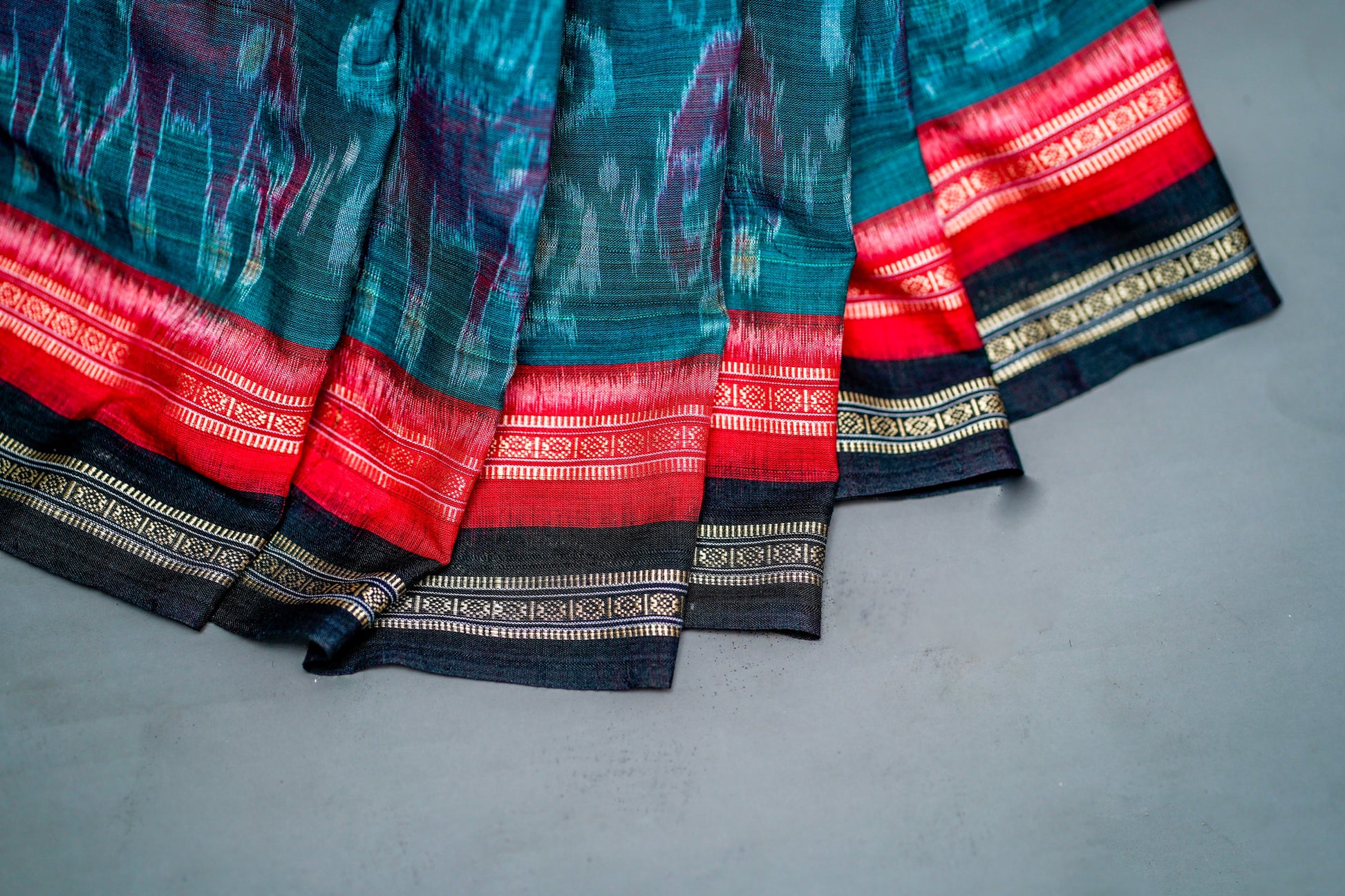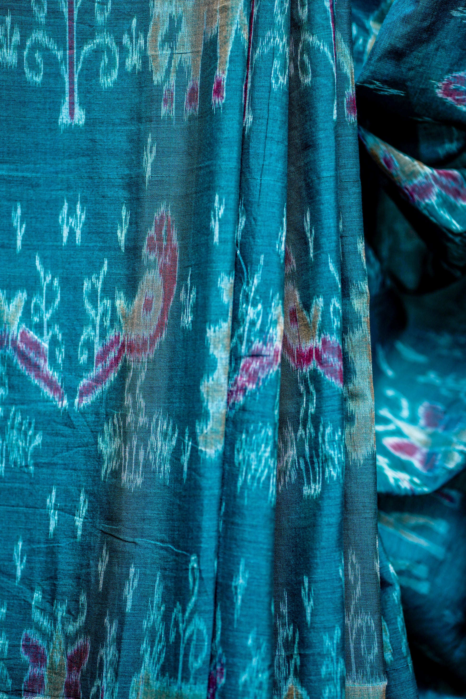 - Colour: Deep Teal Green Base with Multi-Coloured Ikat Motifs; Rich Maroon & Black Pallu