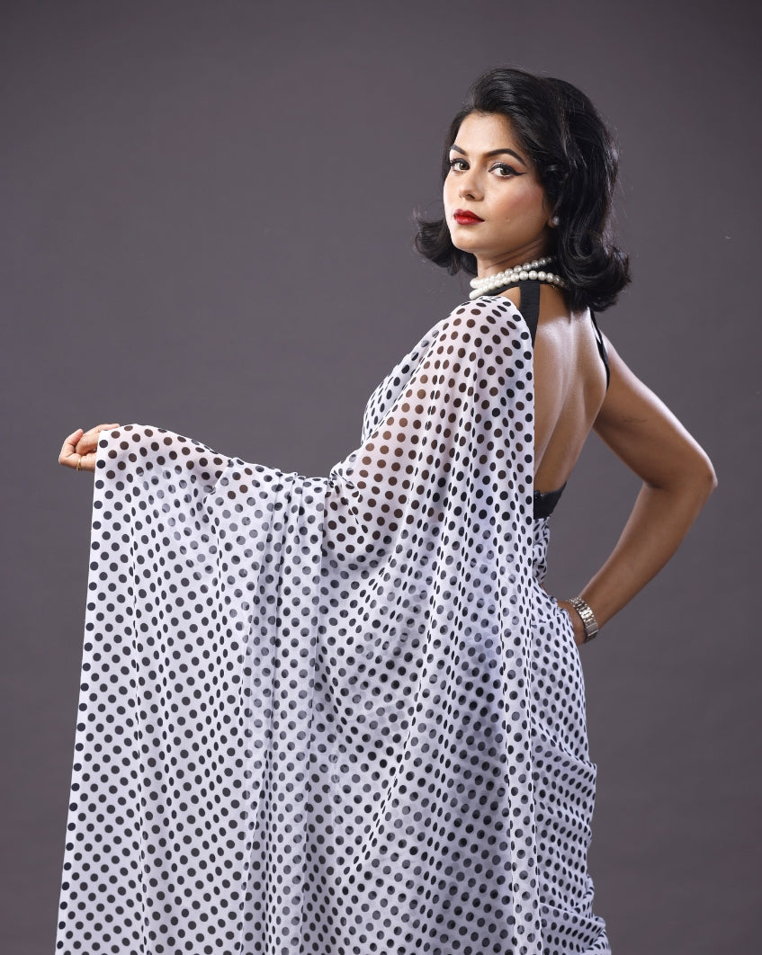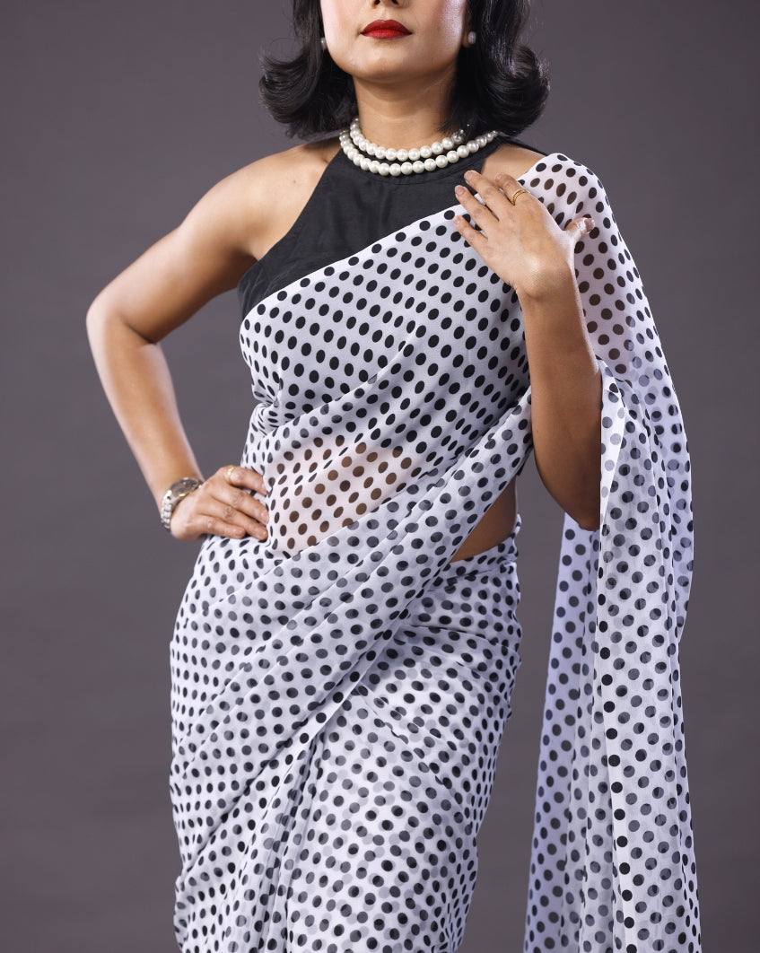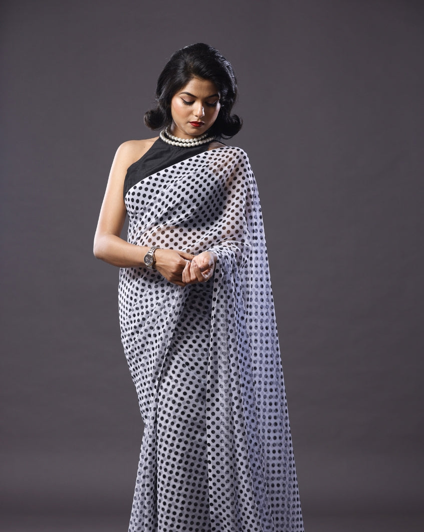 This beautiful piece of Polka Dot is an ideal example of wooden Block print . Black round dots or circles evenly spaced on pure georgette give it a complete retro look. Wear it on a sunny afternoon else club it with pearl for summer in the evening.