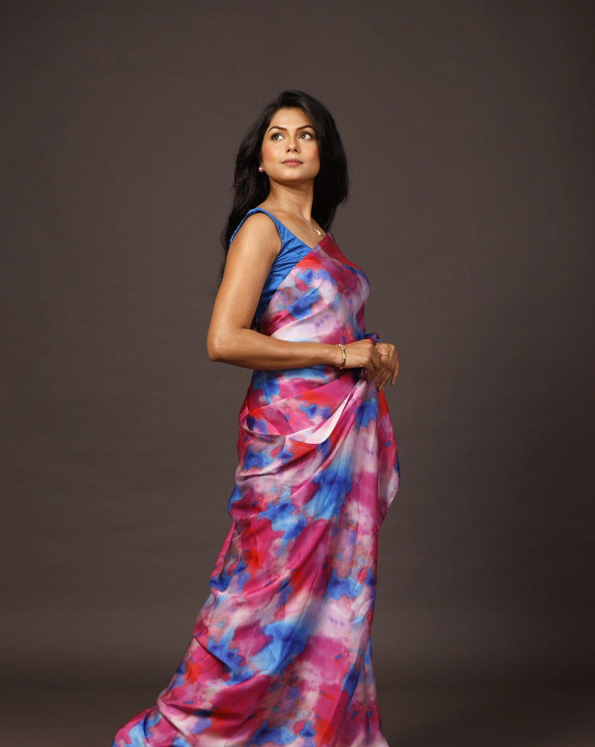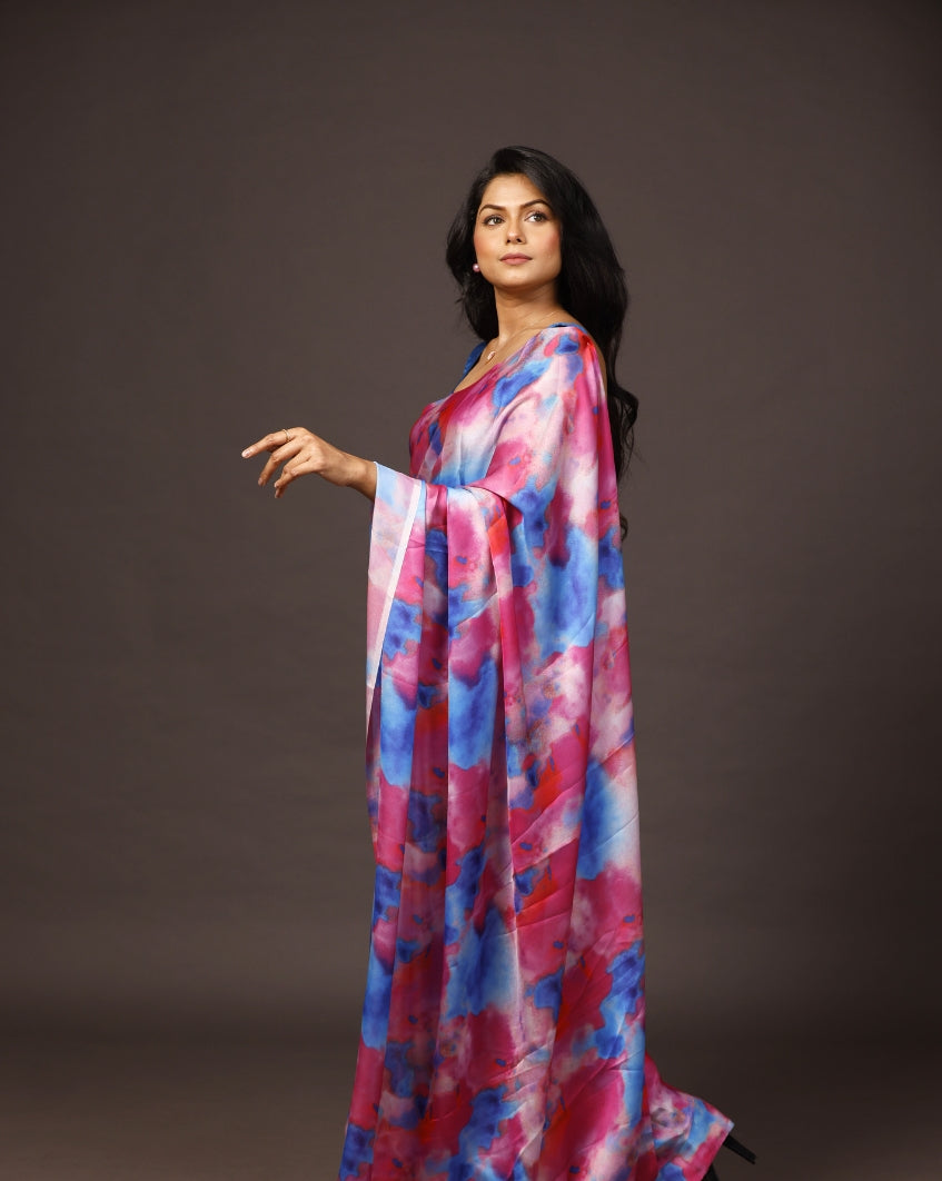 This beautiful piece of multicolort saree is an ideal example of Classic Dye . Artistic prints derived from this technique on Satin georgette will grace your wadrobe this summer. Wear it on a sunny afternoon else club it with pearl for summer in the evening.