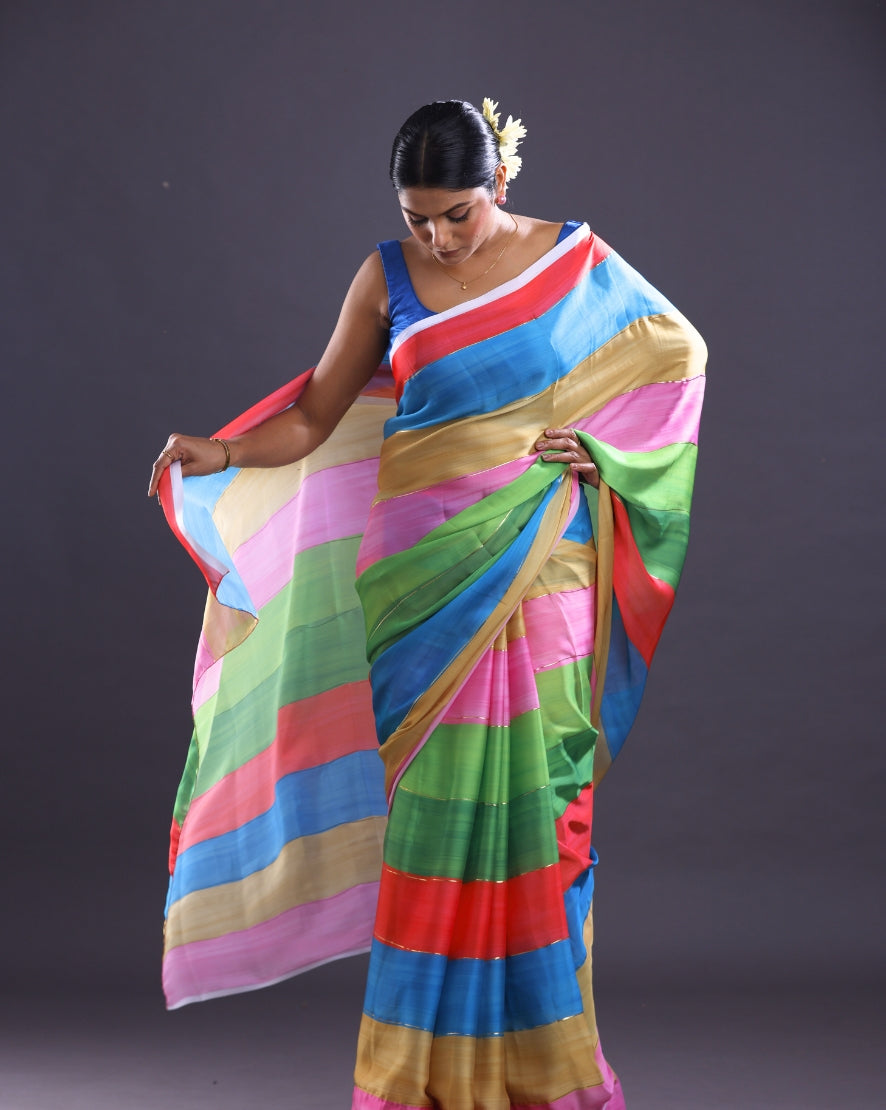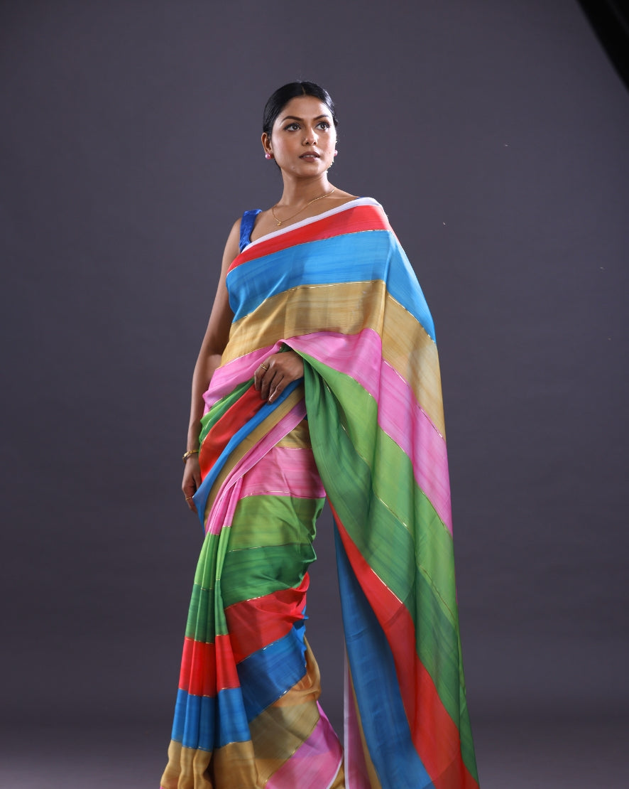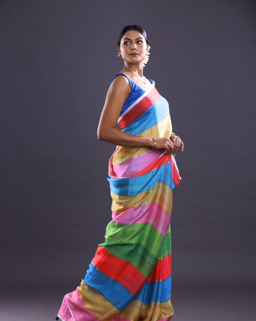 This beautiful piece of Multi Color saree is an ideal example of Classic Dye. Artistic prints derived from this technique on Satin georgette will grace your wadrobe this summer. Wear it in a sunny afternoon else club it with pearl for summer evening.