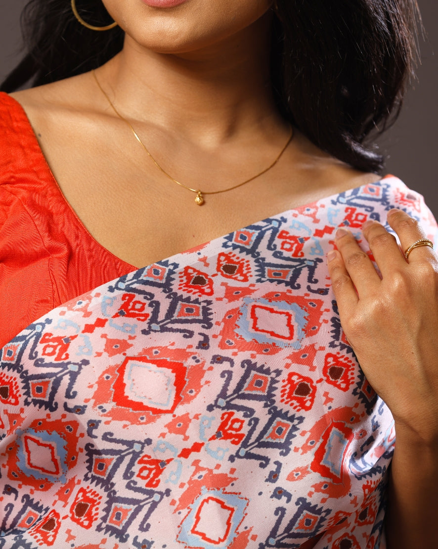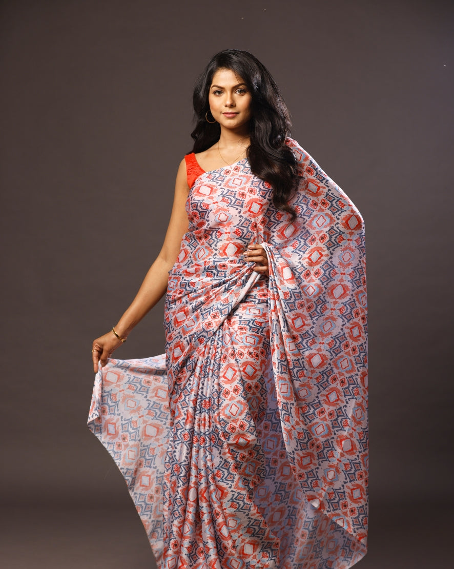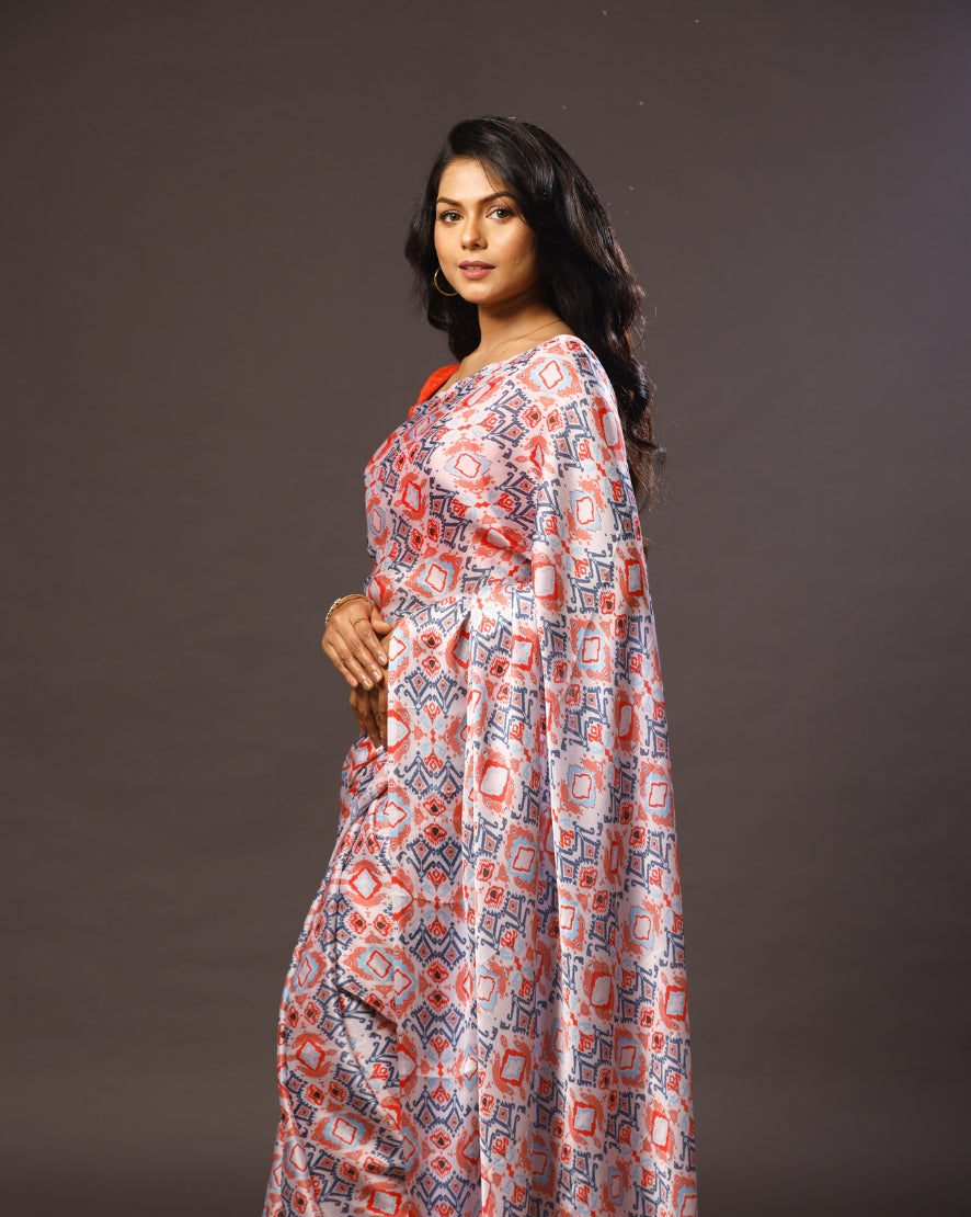 This beautiful piece of Multi Color saree is an ideal example of Block Print. Artistic prints derived from this technique prints on Satin georgette will grace your wadrobe this summer. Wear it in a sunny afternoon else club it with pearl for summer in the evening.