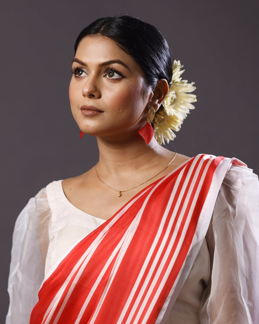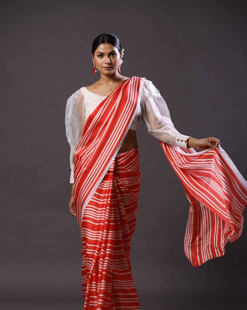 This beautiful piece of Red and White saree is an ideal example of Classic dye. Artistic prints derived from this technique prints on Satin georgette will grace your wadrobe this summer. Wear it in a sunny afternoon else club it with pearl for summer in the evening.