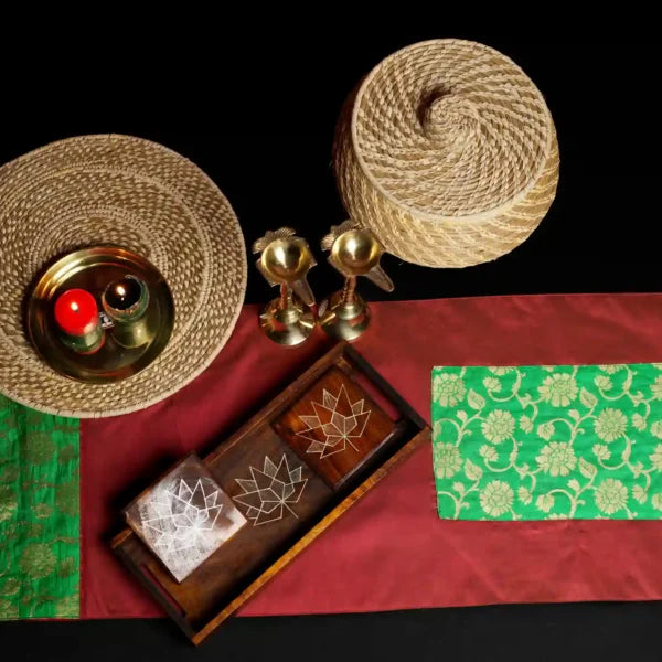 Crafted with the finest quality Banarsi Brocade and Silk Blend fabric, the Table runner is one of the accessories that complete your entire coffee table/dining table look. \nDecorate with a brass candle lamp, wooden coaster or beautiful candles and flowers.